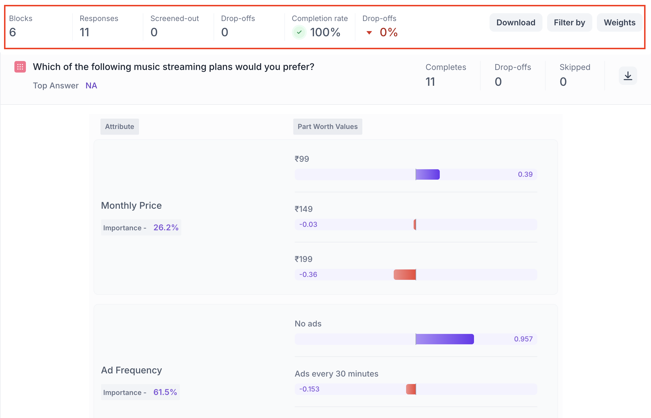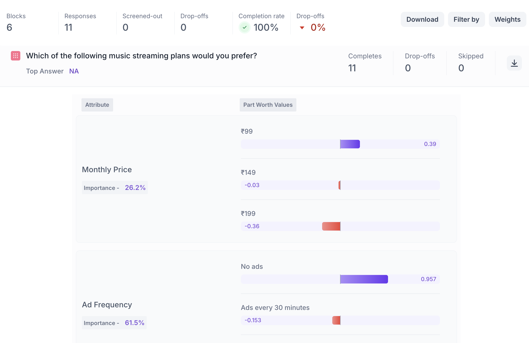 Once your Conjoint study is live and responses are collected, Decode automatically analyzes the data and presents results in a clear, interactive visual format designed for decision-making.