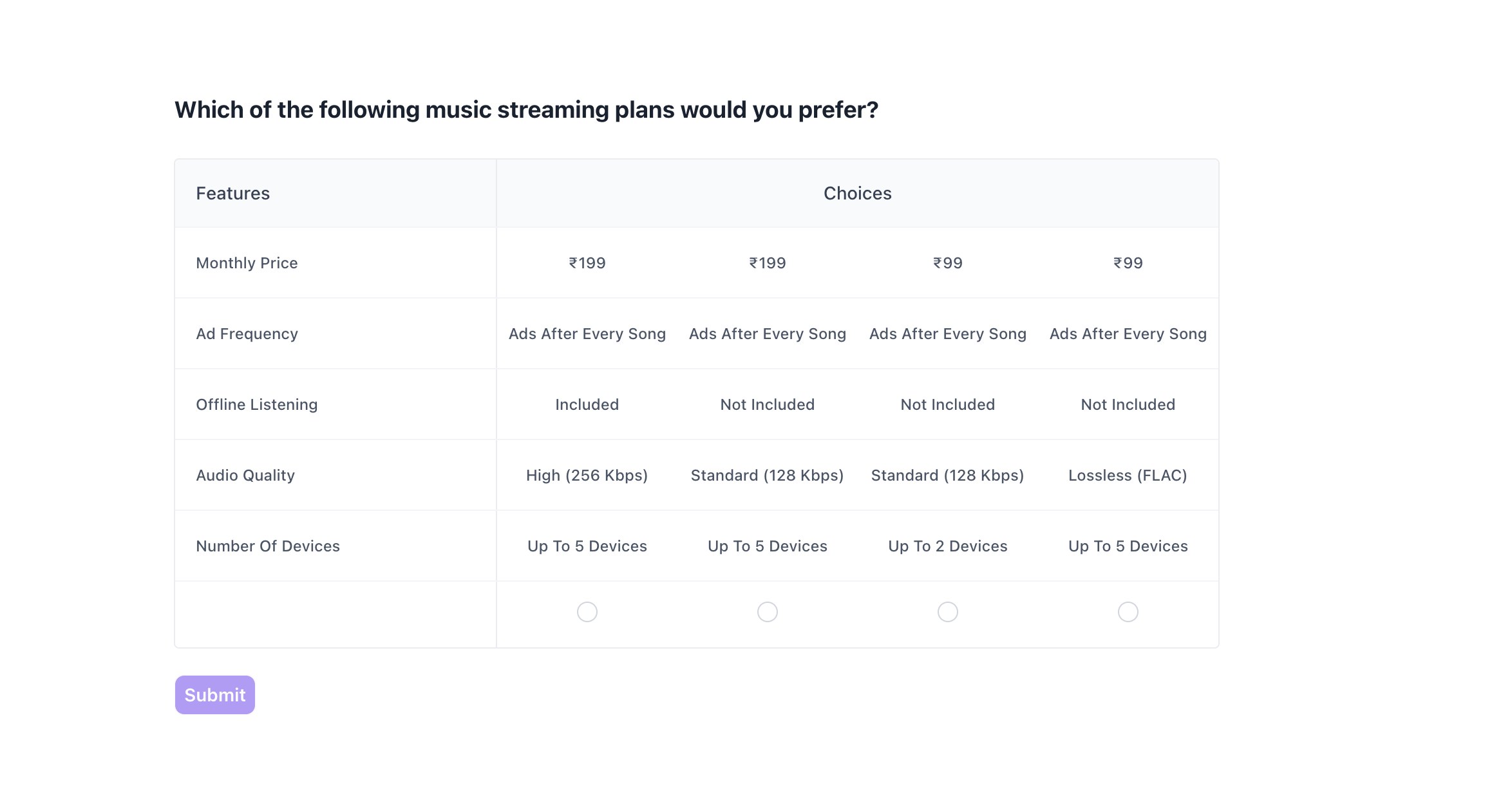 - Feature-first layout: Attributes such as Price, Ad Frequency, Offline Listening, Audio Quality, and Number of Devices are listed vertically on the left for easy comparison across all options.