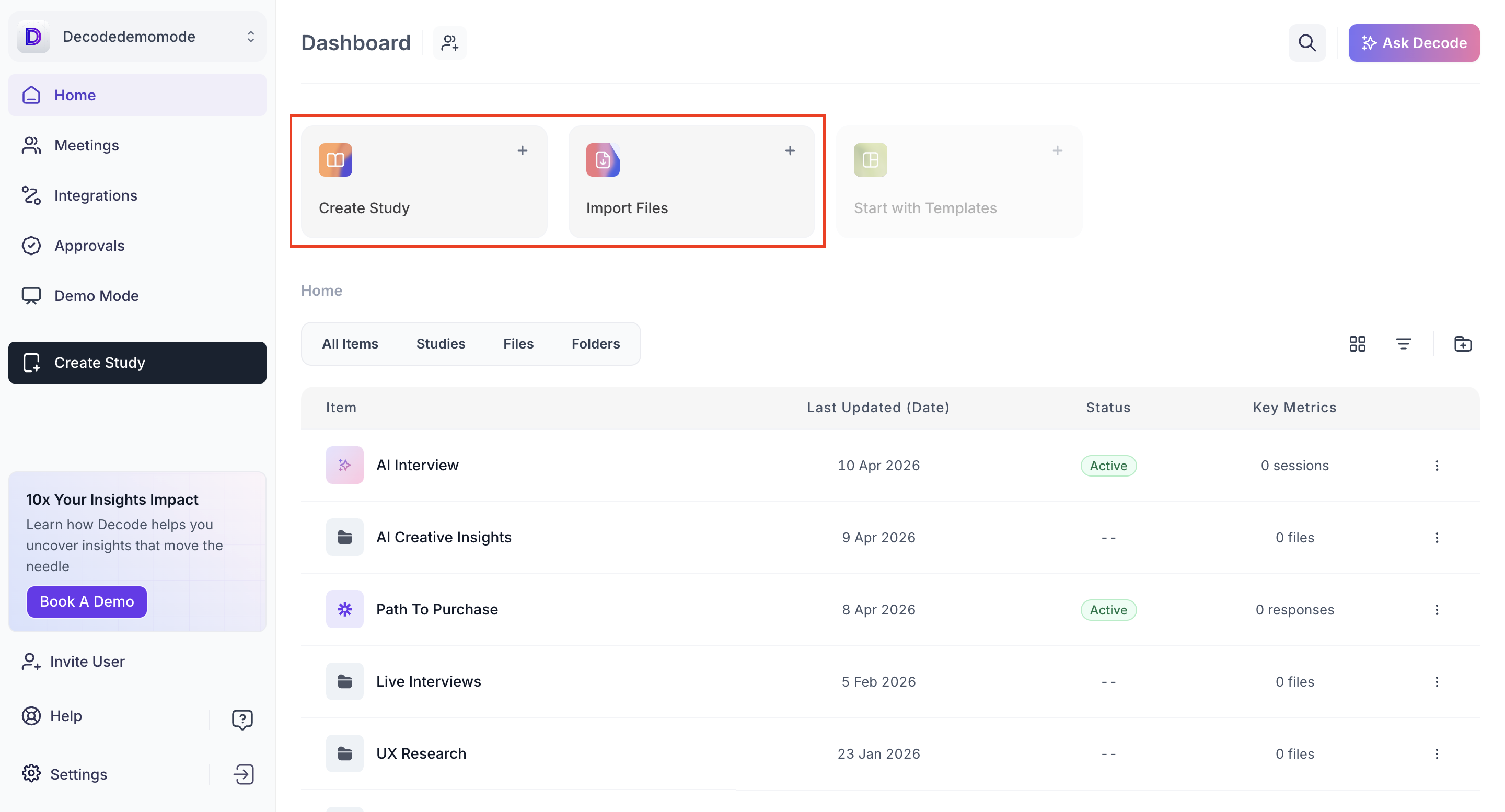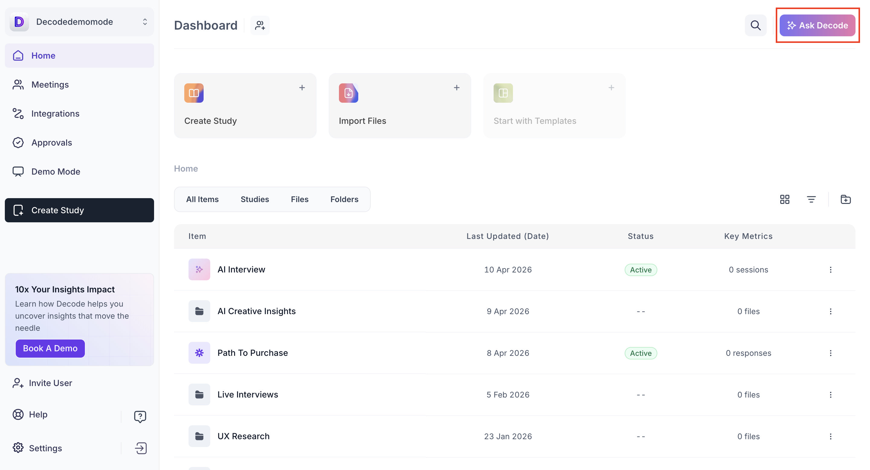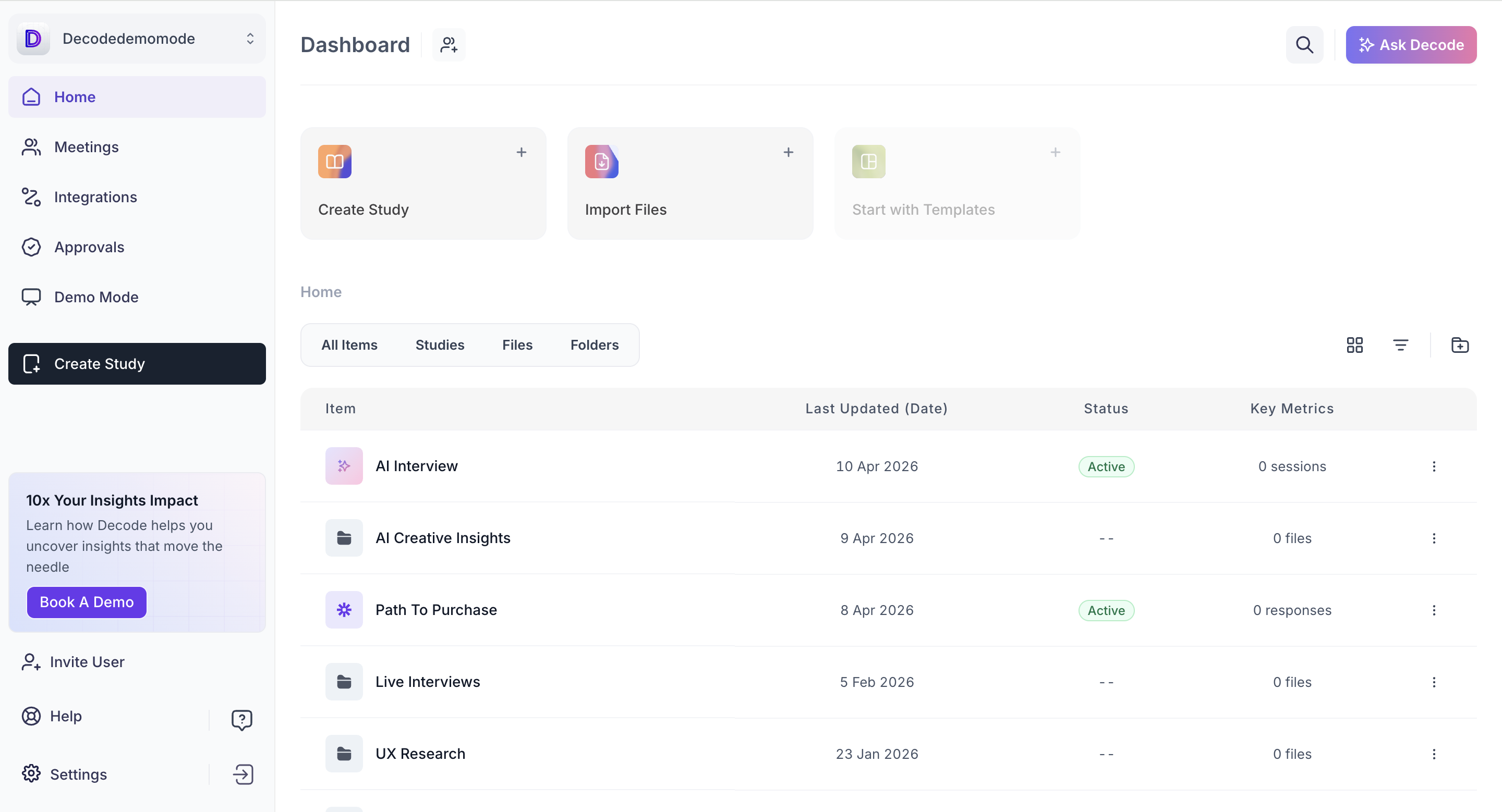 The Decode Dashboard is your central hub for managing research activities. From here, you can launch new studies, organize files, track responses and access key insights across your workspace. The dashboard provides a clear, organized view of all your ongoing and past projects.