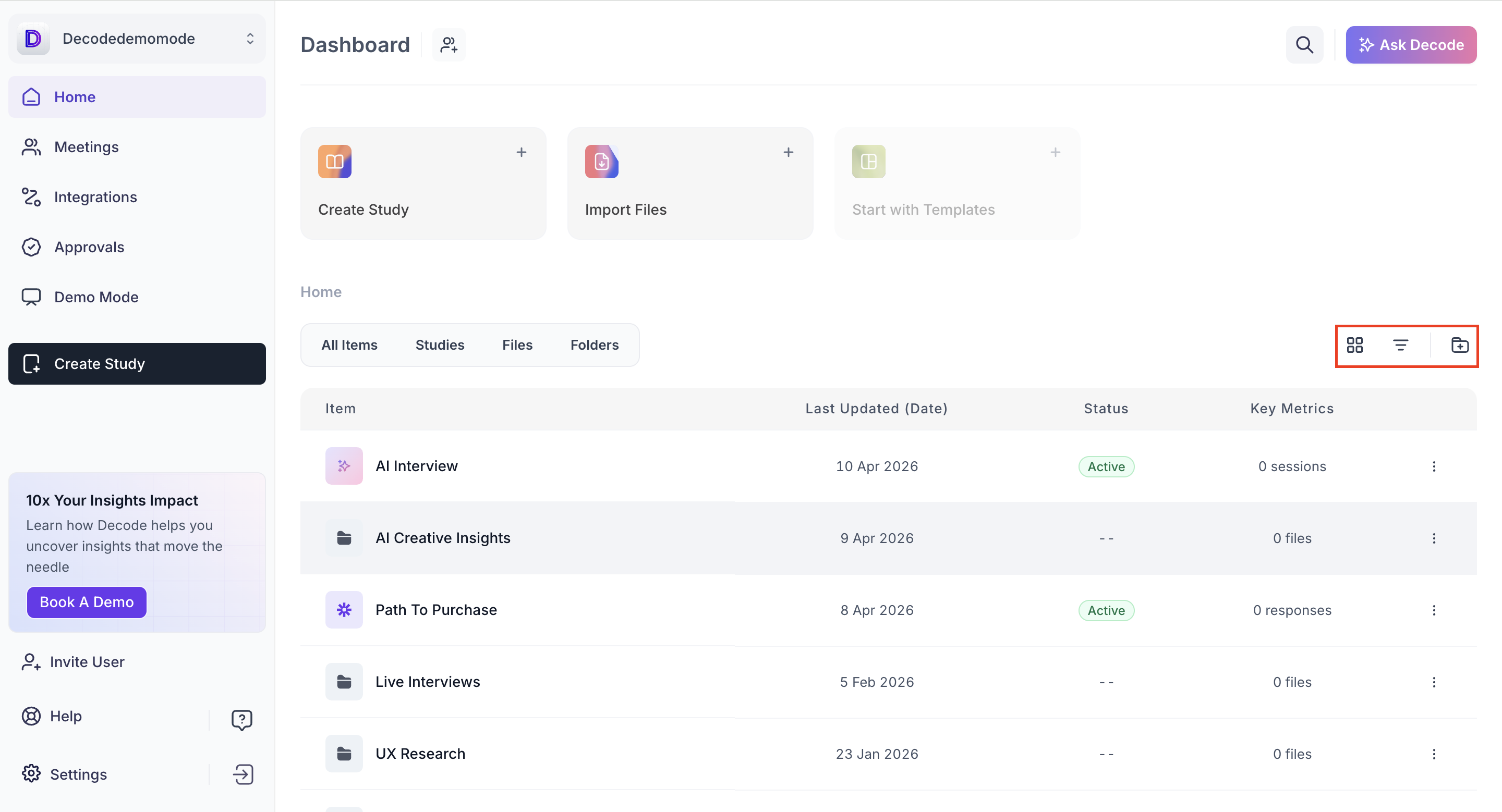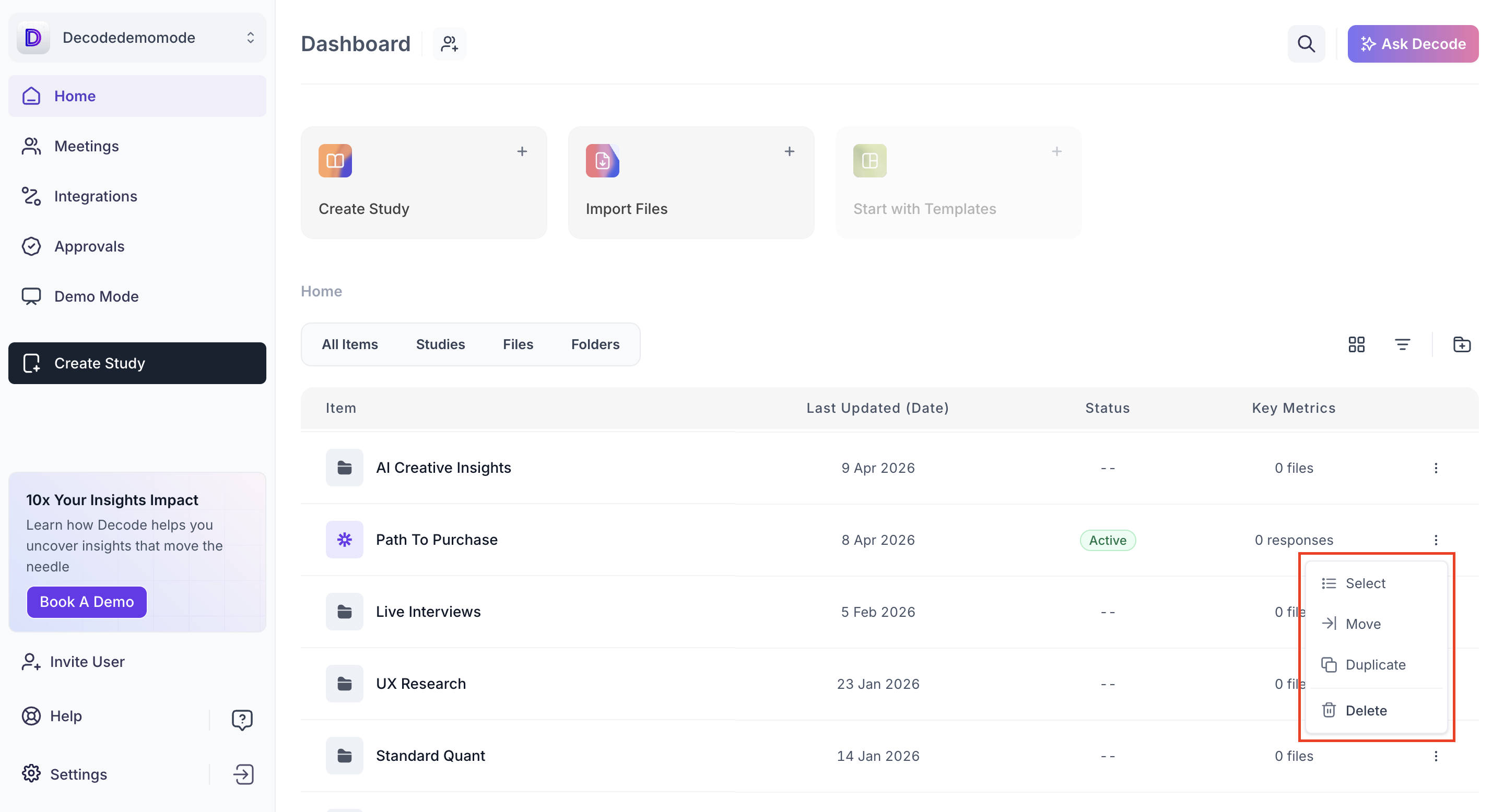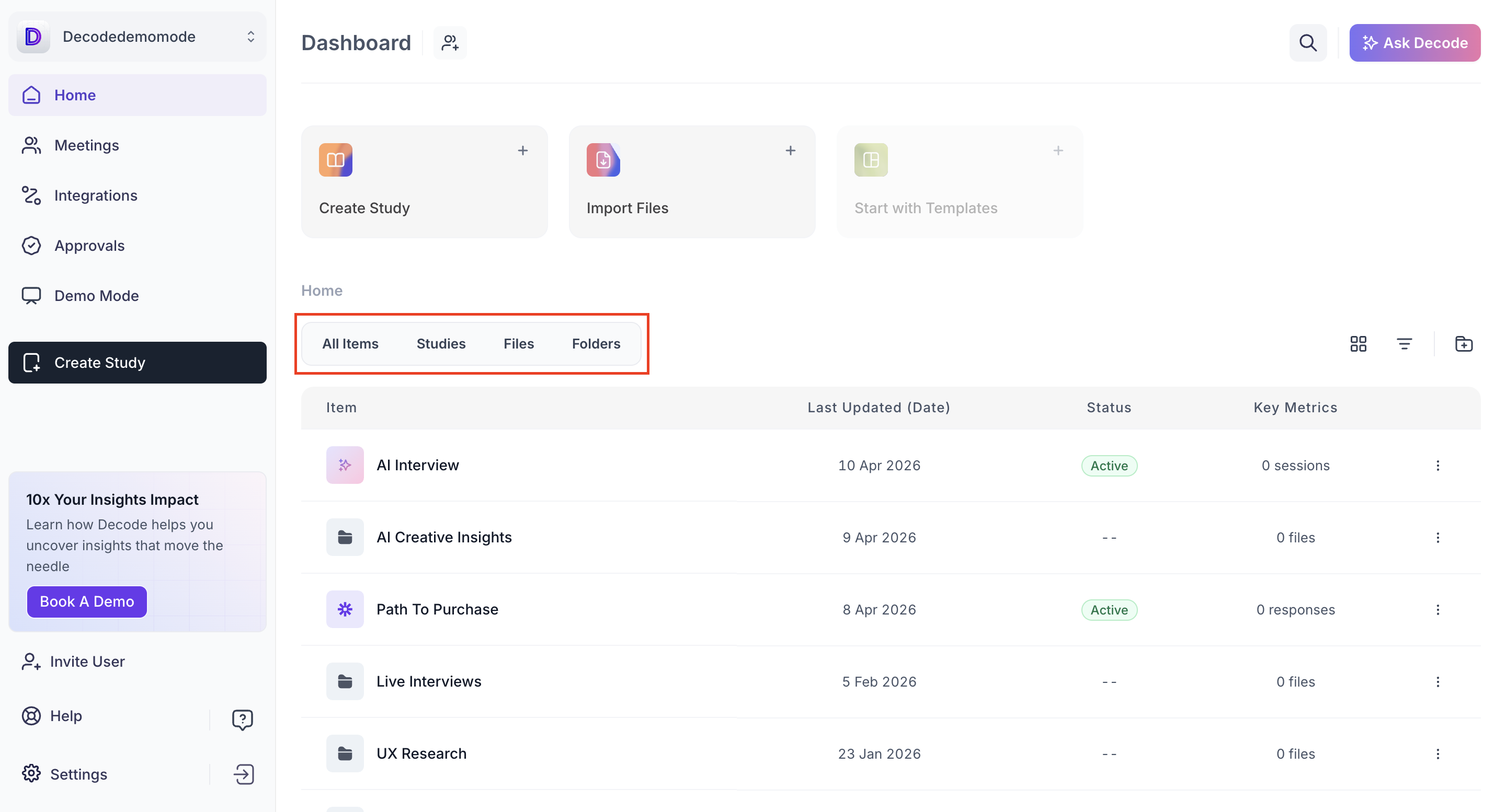 The Decode Dashboard is your central hub for managing research activities. From here, you can launch new studies, organize files, track responses and access key insights across your workspace. The dashboard provides a clear, organized view of all your ongoing and past projects.