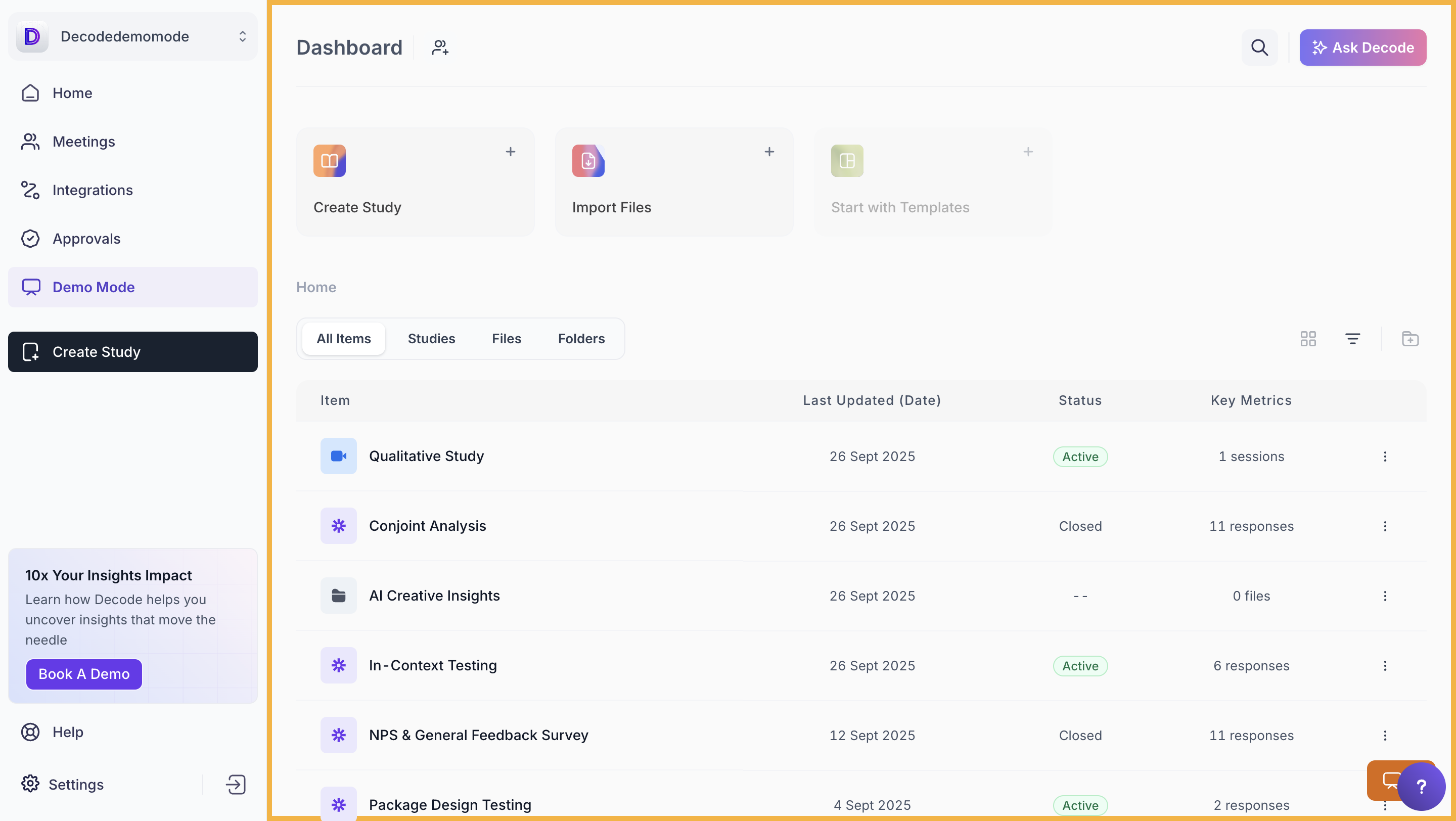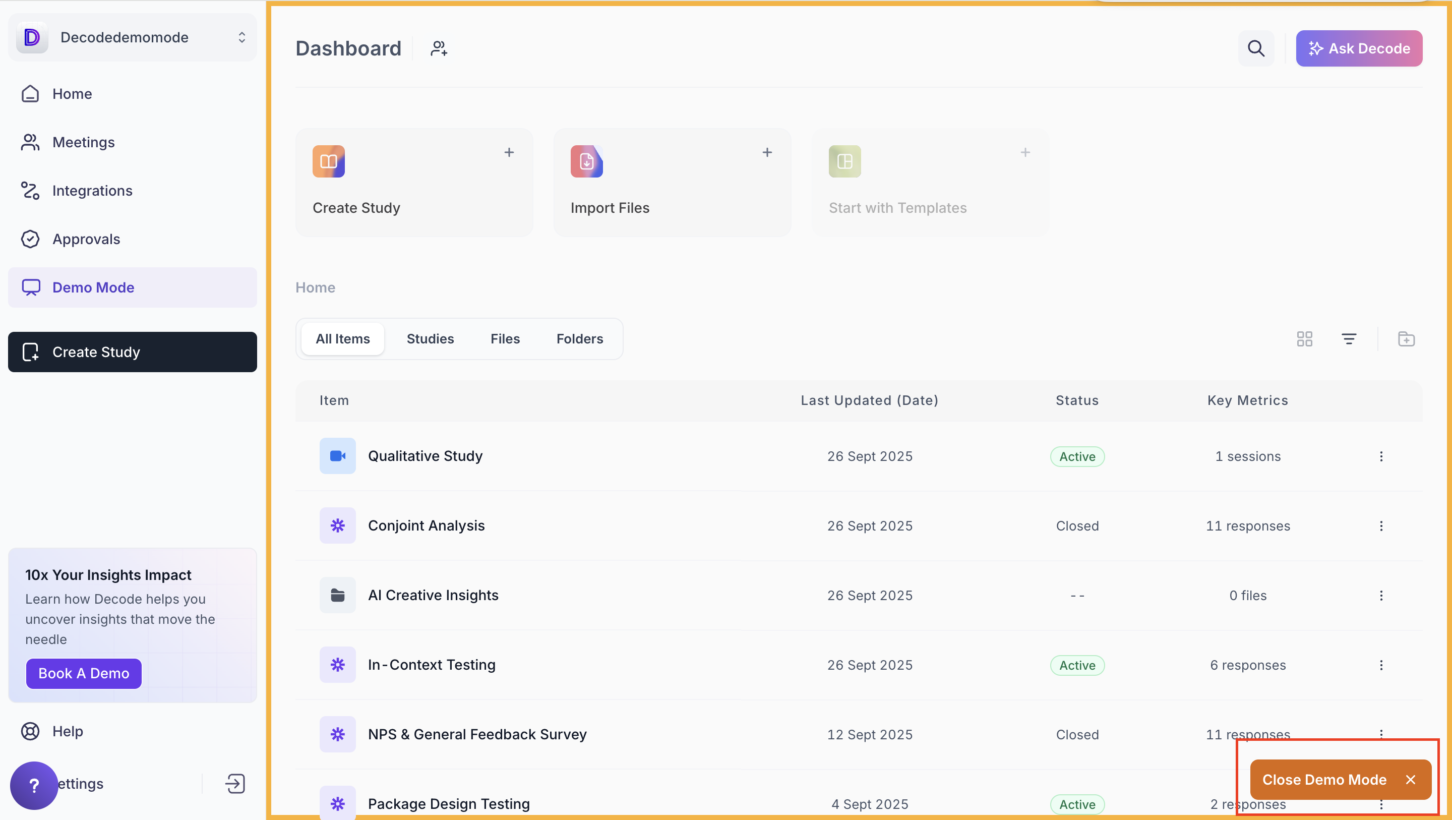 Demo Mode is an interactive environment that allows you to explore Decode’s research and study creation features without making any permanent changes or affecting live data. Think of it as a safe, controlled space where you can freely interact with the platform and learn how it works.