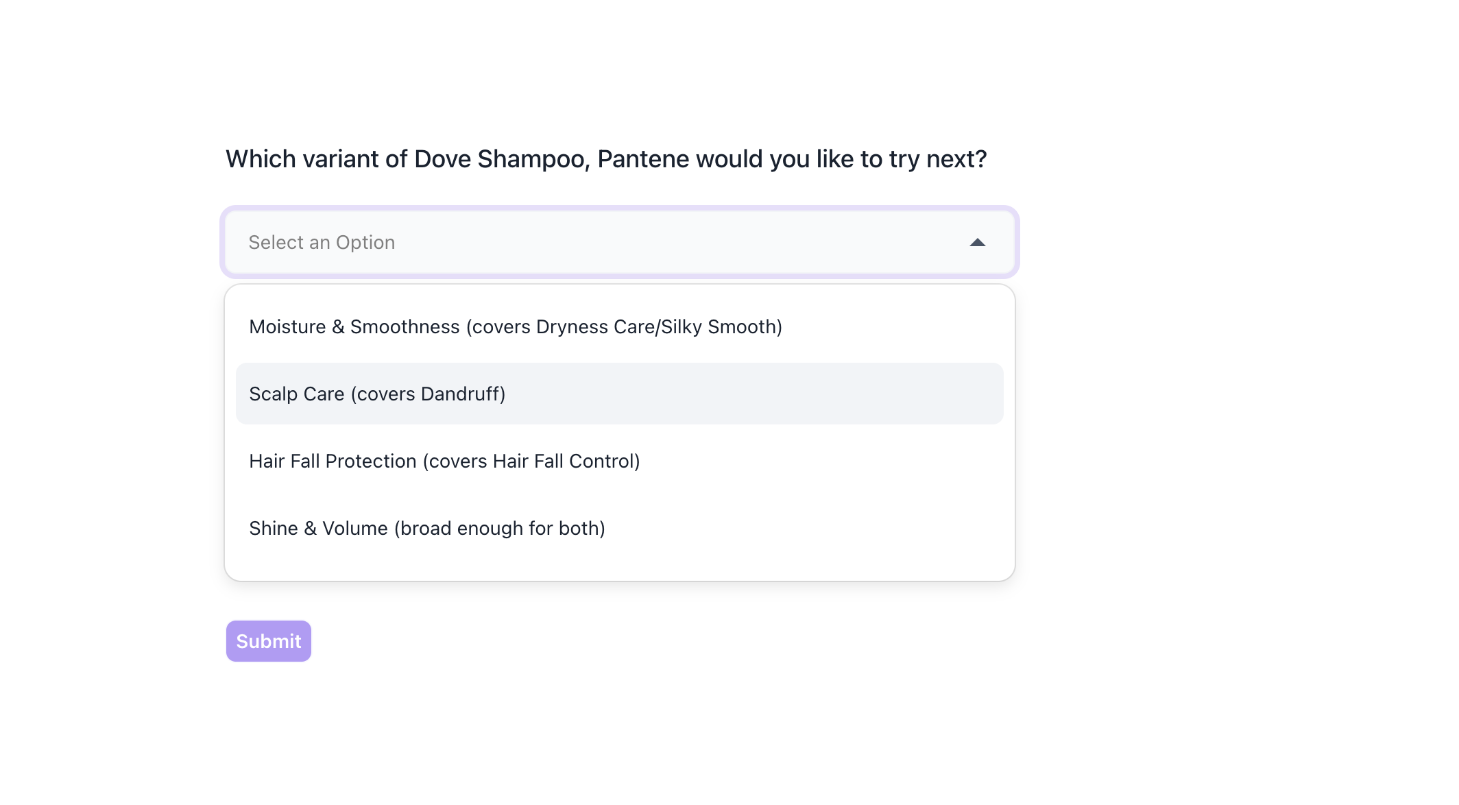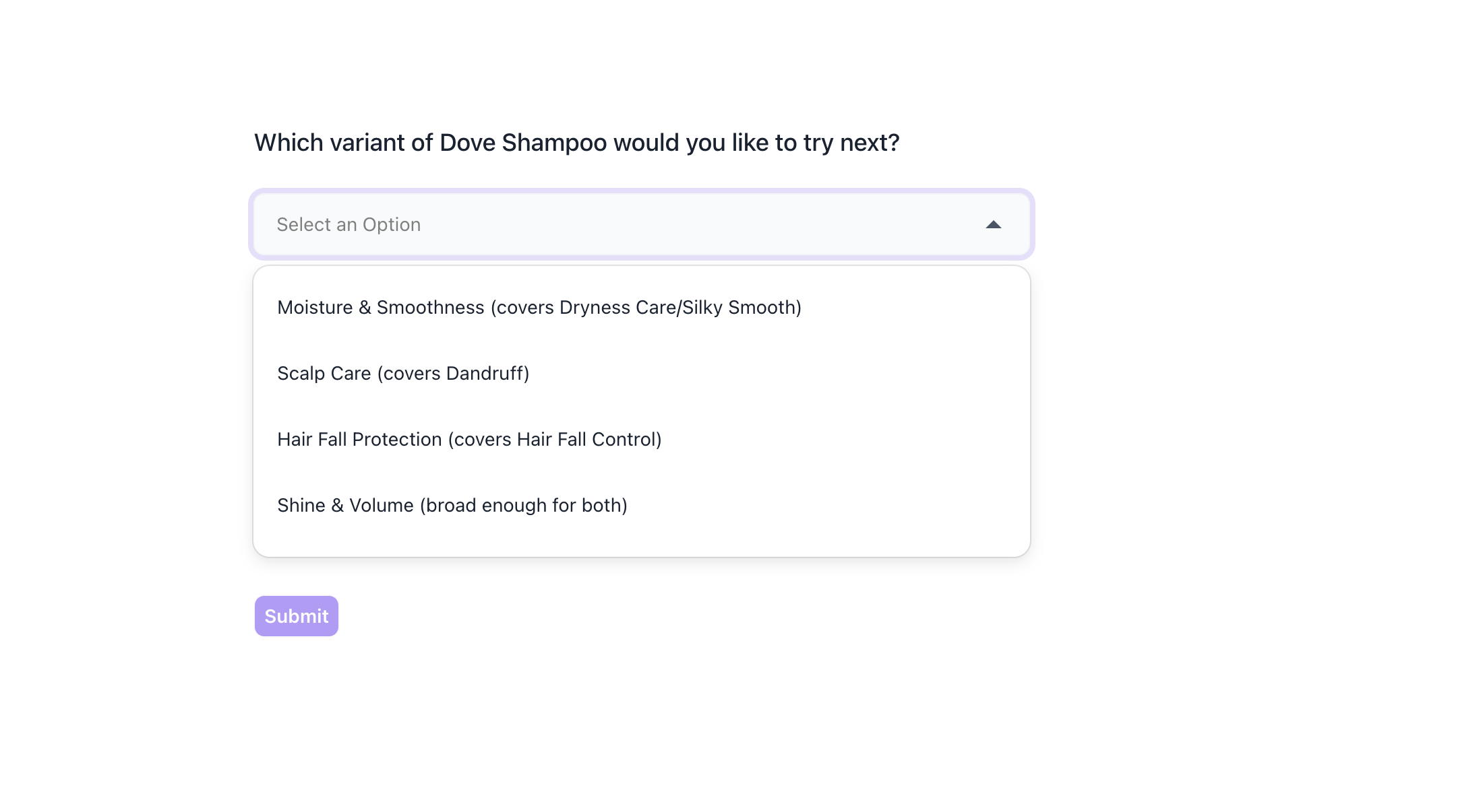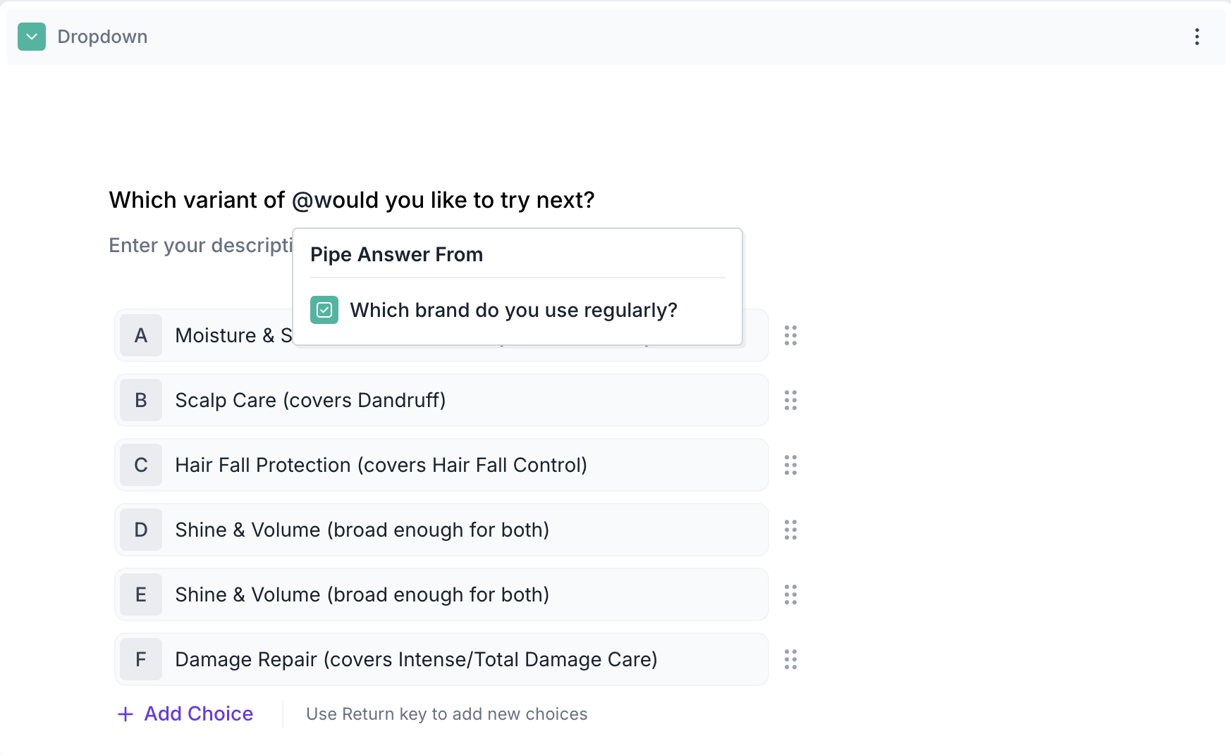 Respondents View: If they selected Dove Shampoo in previous question, then dropdown question will appear as, Which variant of Dove Shampoo would you like to try next?
