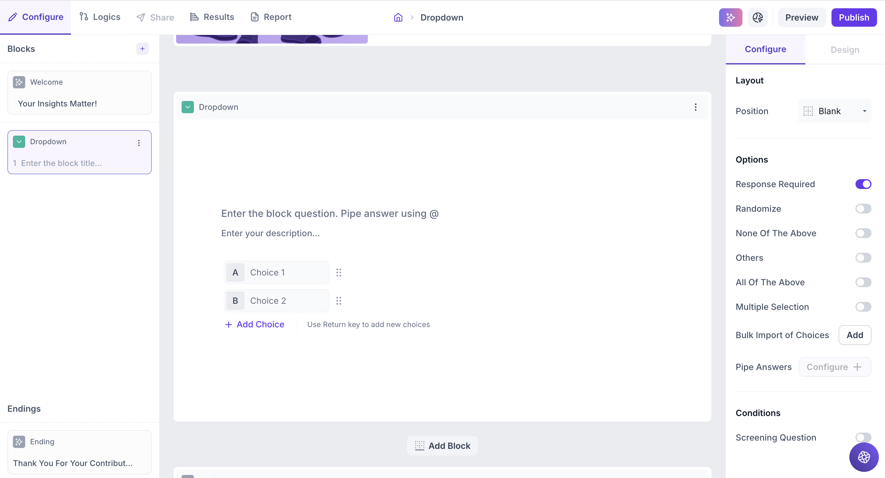 By default, the dropdown allows respondents to select only one option, but you can enable multi-select in the block properties if needed.