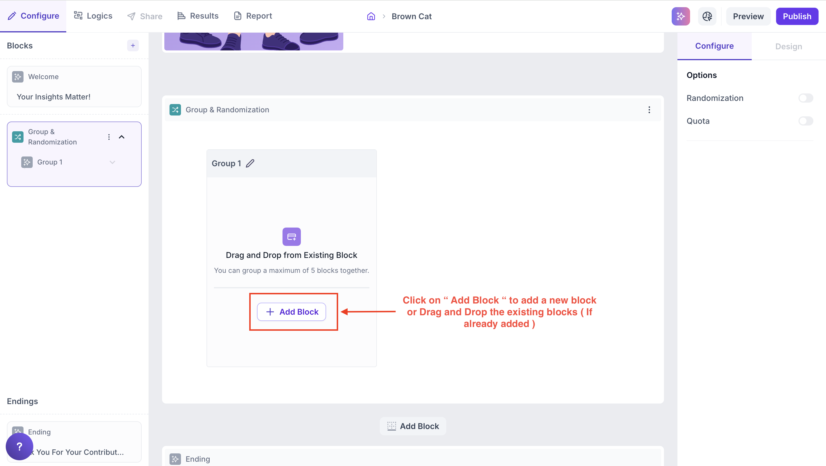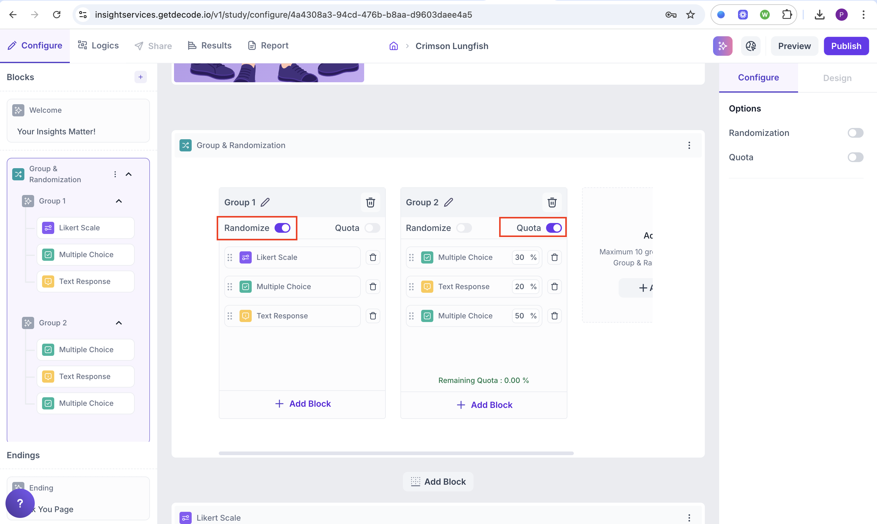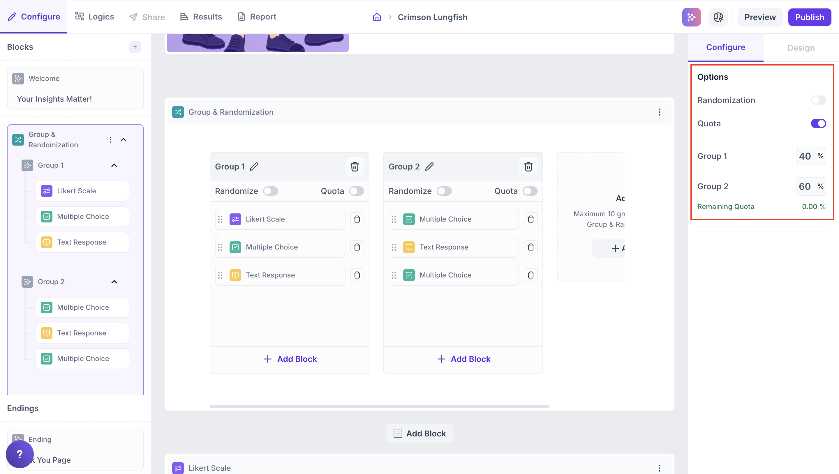 - Set Quota per Block - Allocate respondents to specific blocks within a group (must total 100%).
