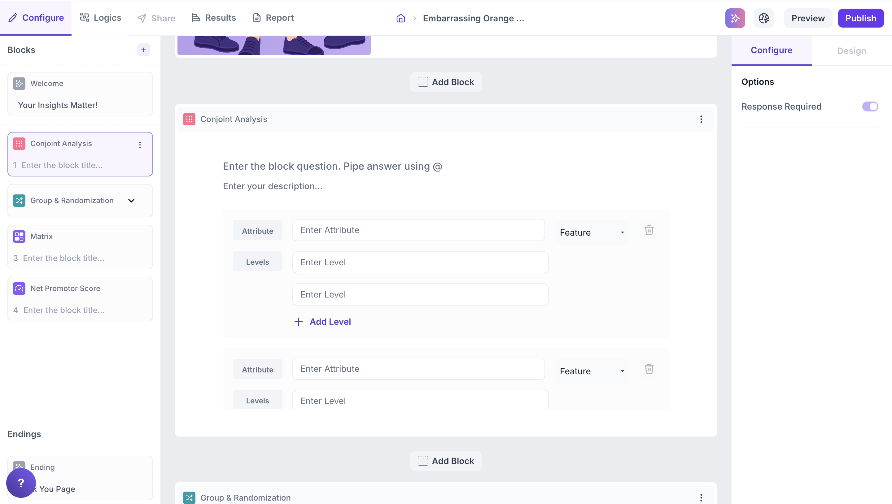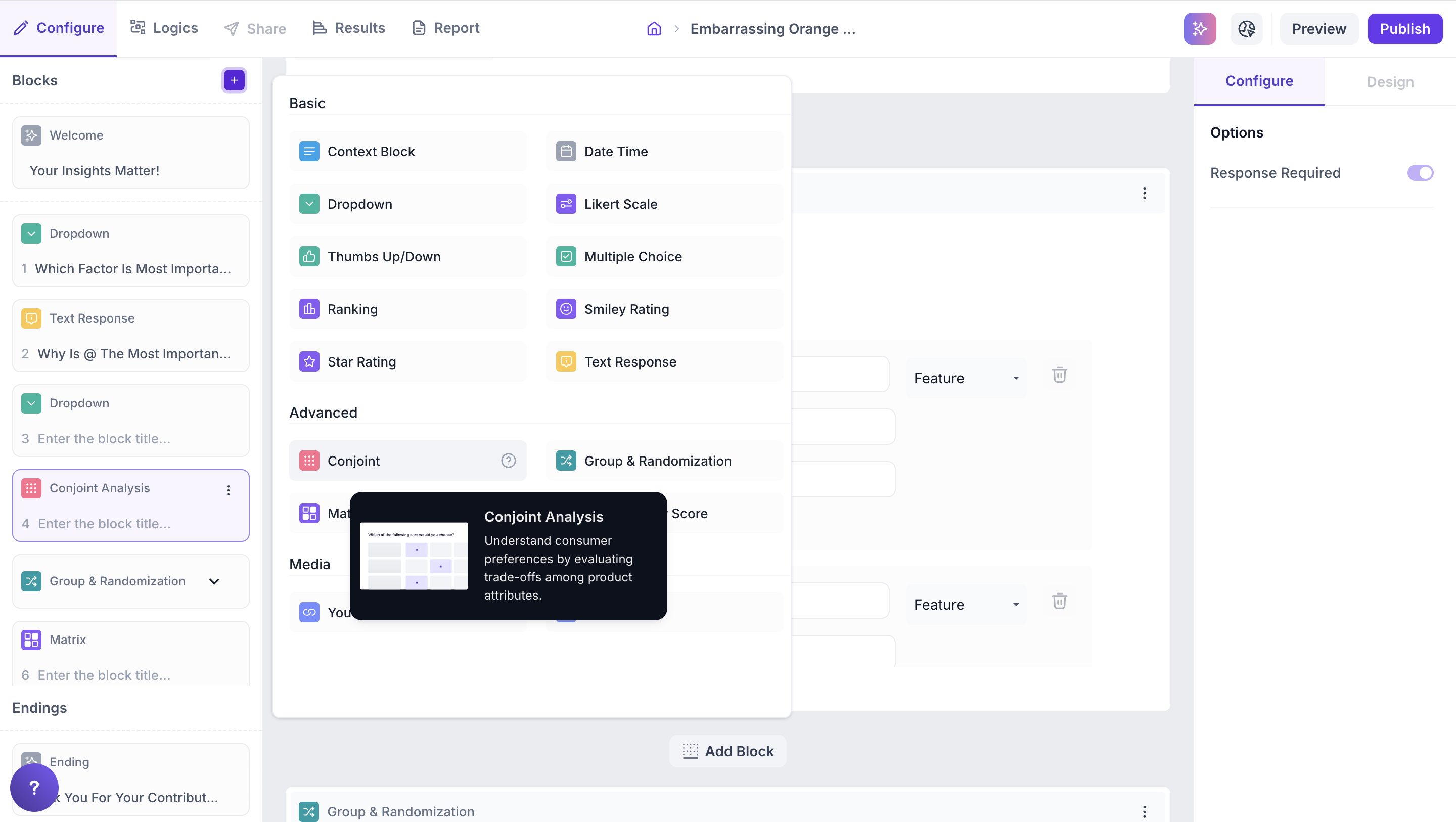 Advanced Blocks in Decode are built for deeper, more sophisticated research. These blocks go beyond standard questions to support detailed comparisons, randomized content, and loyalty measurement. Perfect for analyzing product attributes, segment-based responses, or customer satisfaction at scale.