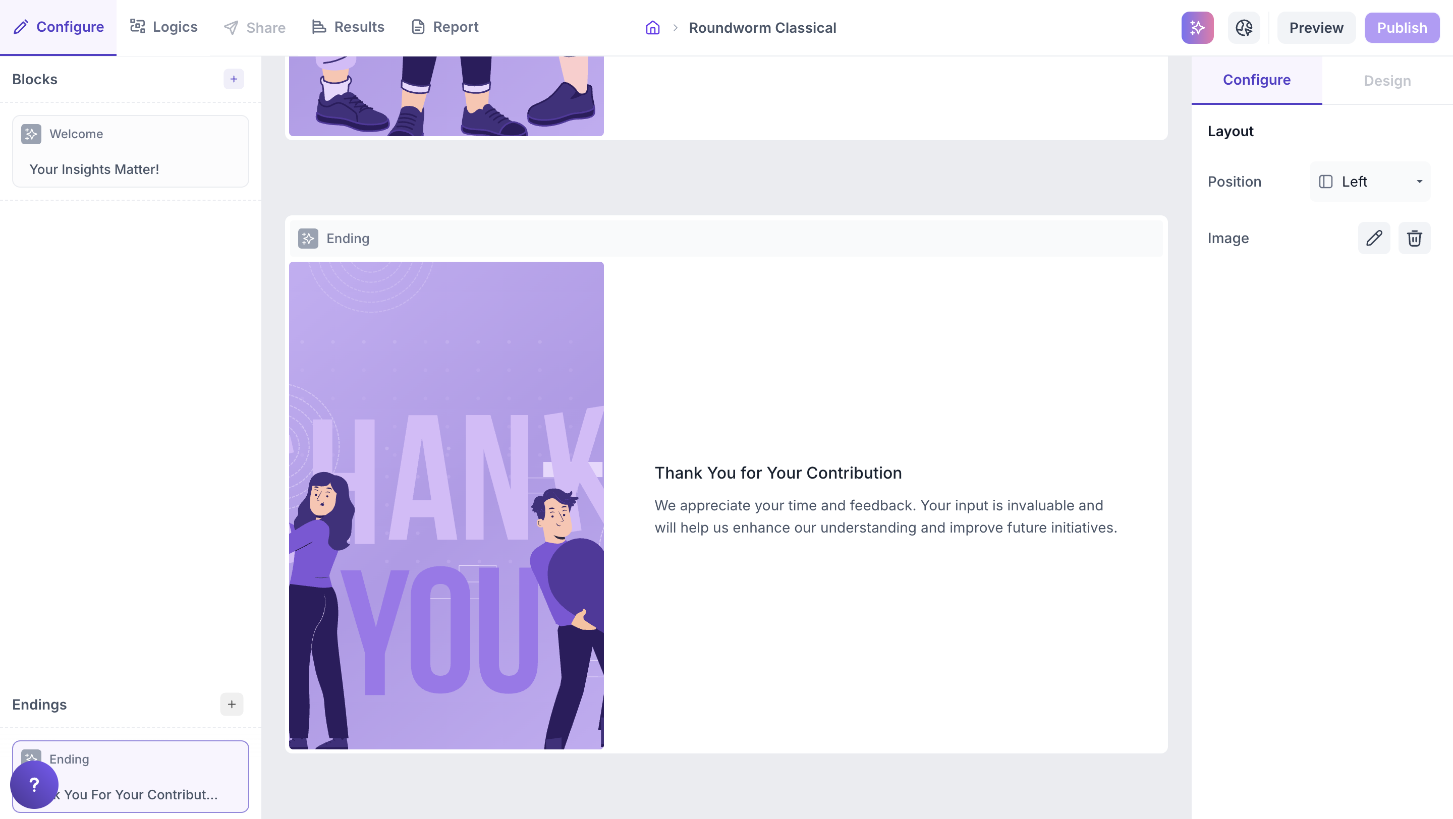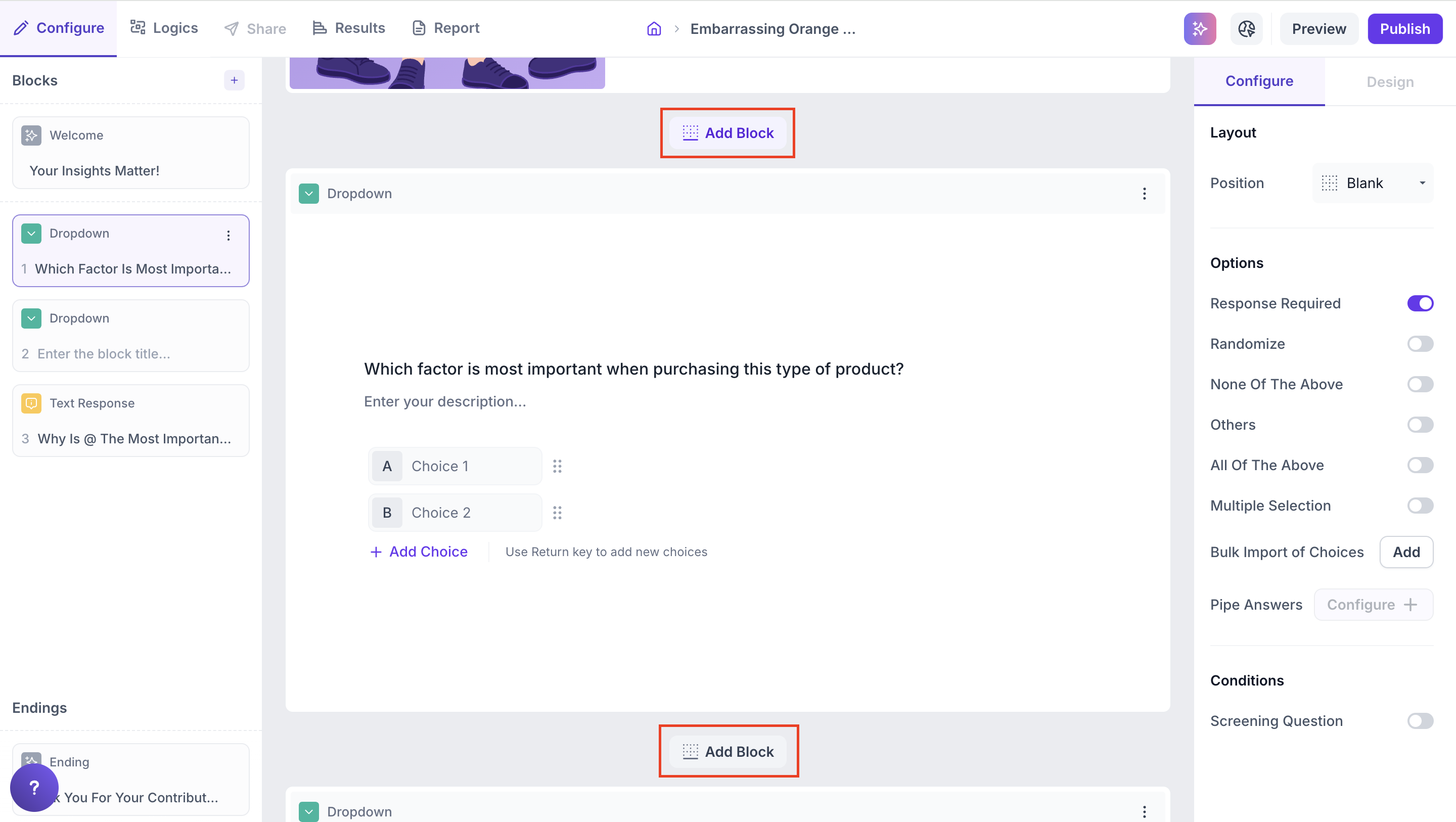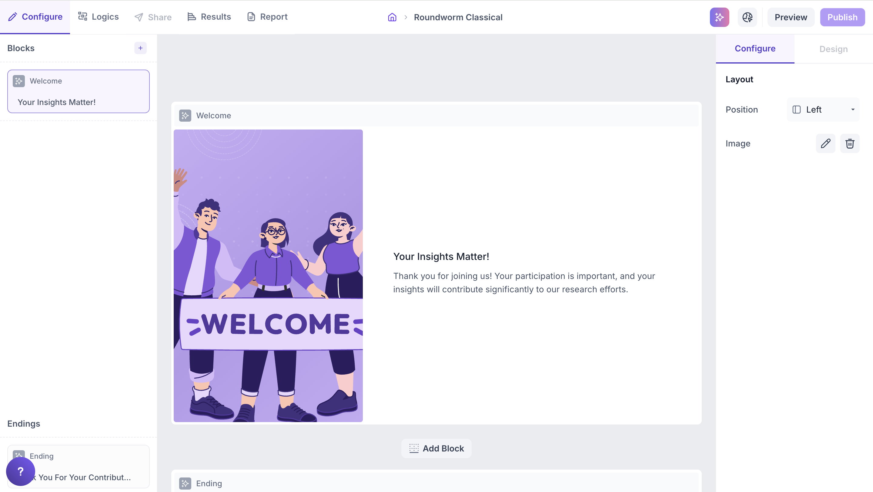 Once your study is created, you'll be redirected to the survey configuration screen. This is where you can set up your study structure and add or edit blocks.