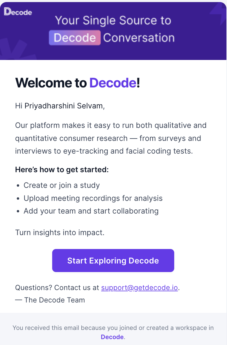 You will also receive a welcome email from Decode at your registered email address. Use the link in the email to access your workspace.