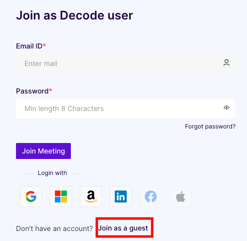 Step 2: If you are a Decode user, you can enter your login credentials and join the meeting.