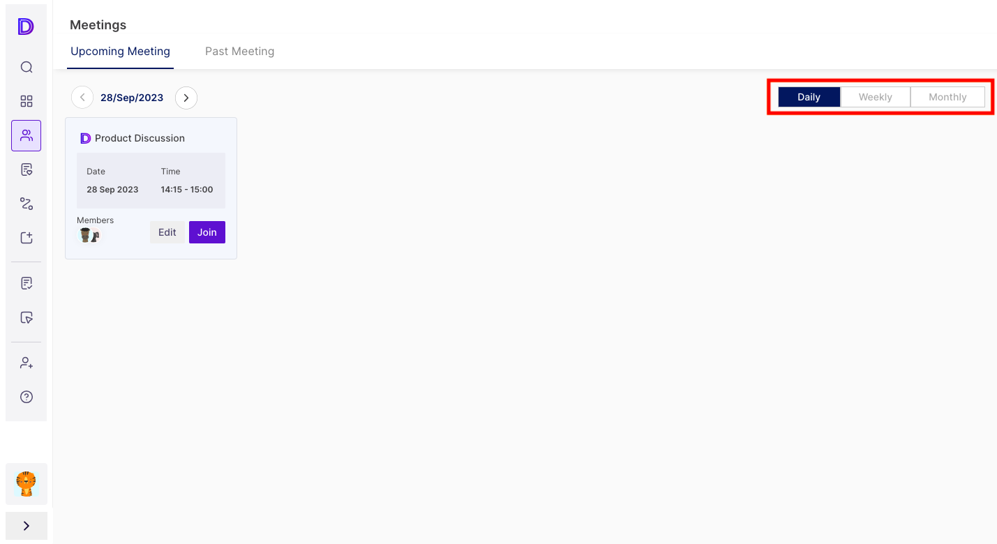 Step 2: On the meeting page, you will find meetings for the day, week and month. You can select the view by clicking on the icon.