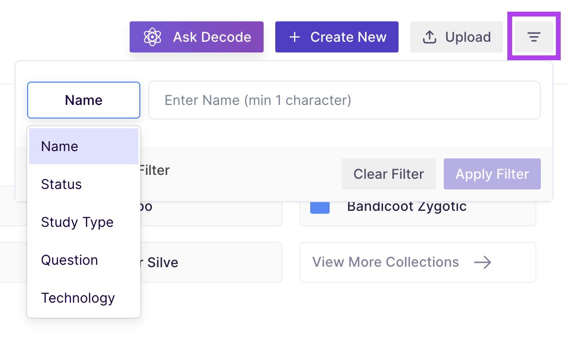 A filter in a search is a way to narrow down the results of a search only to include items that meet specific criteria. On the library page, you can apply a filter in the search to find out specific studies or collections using their name, status, type, type of question asked or technology selected.
