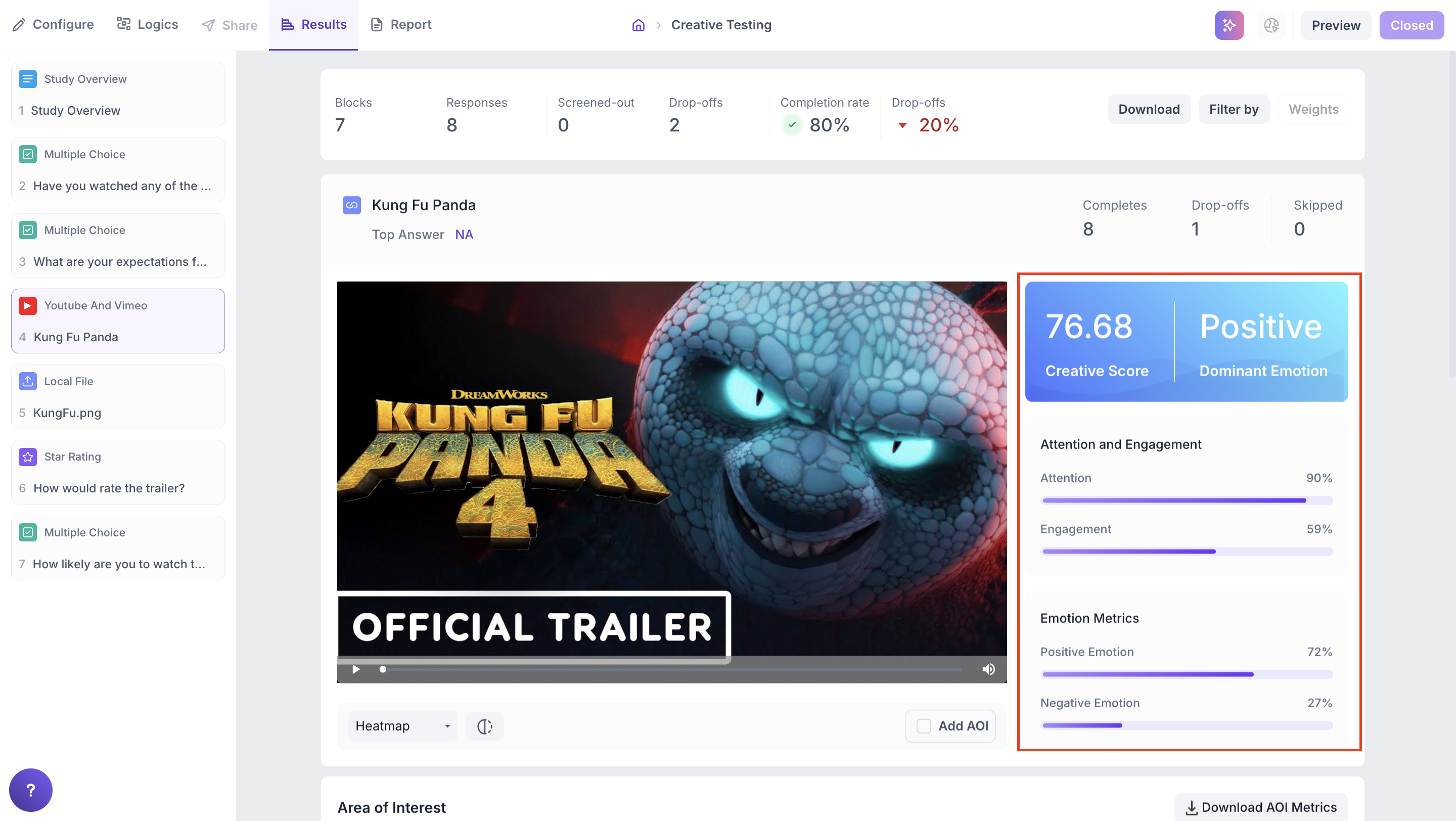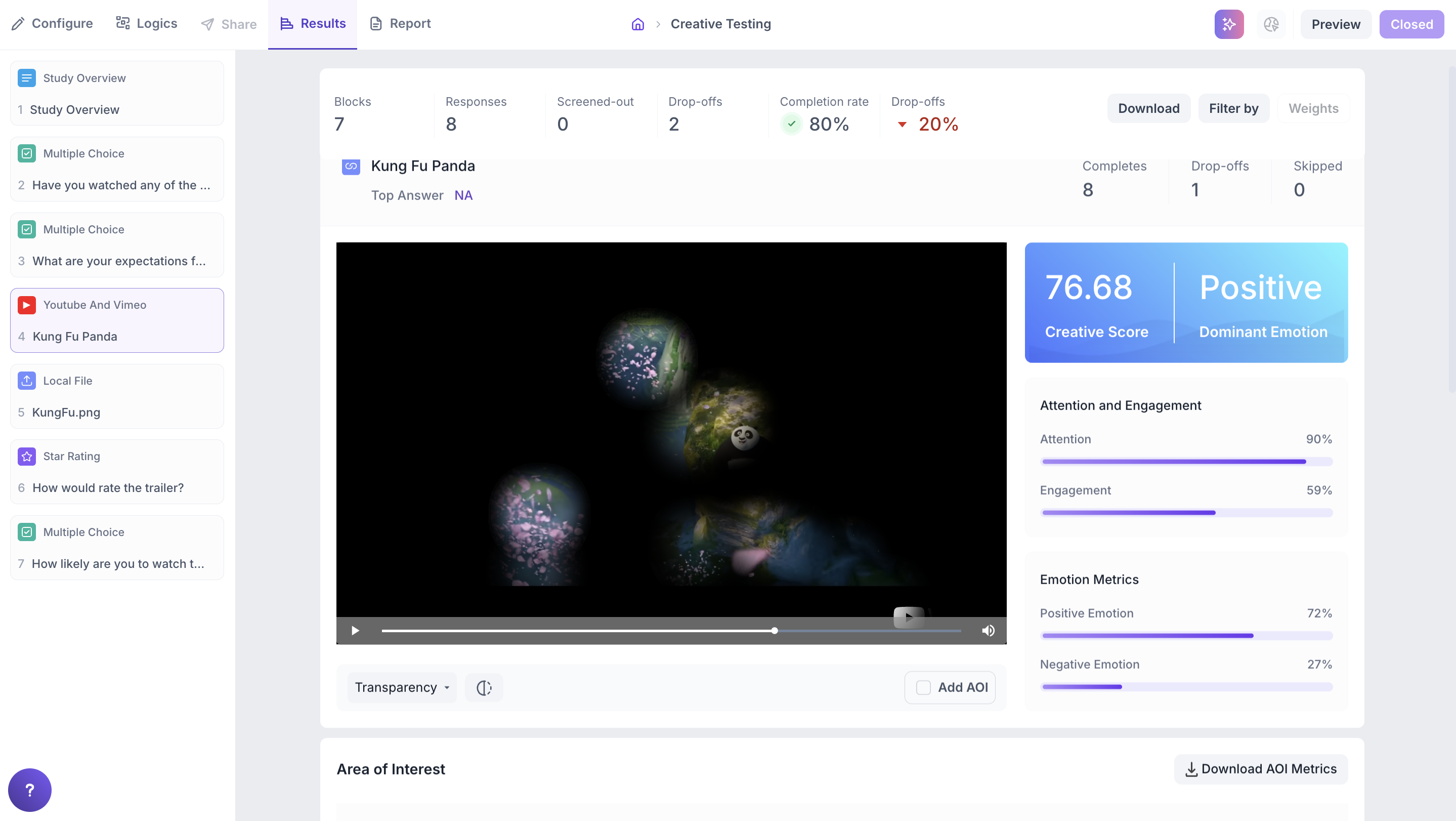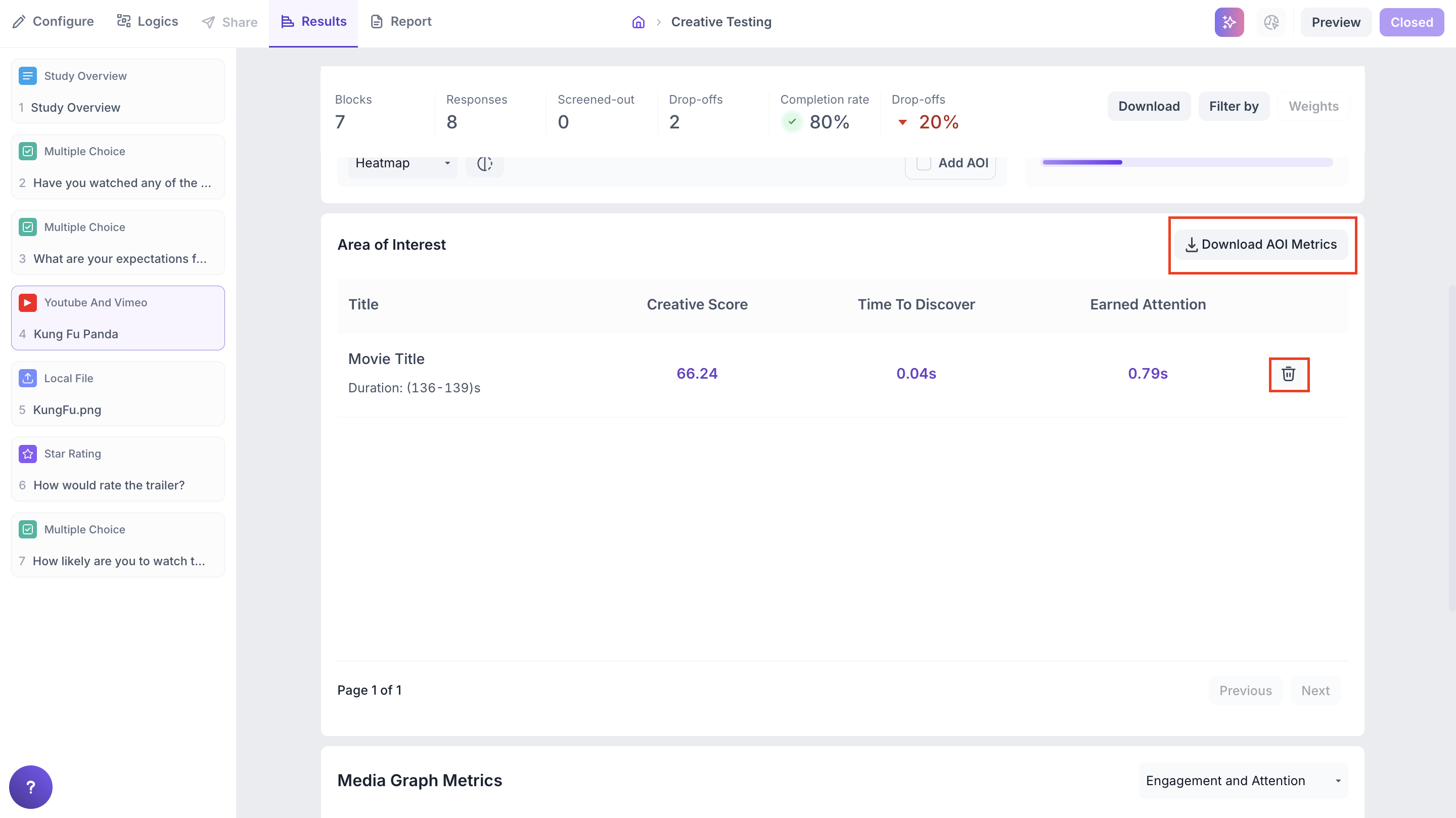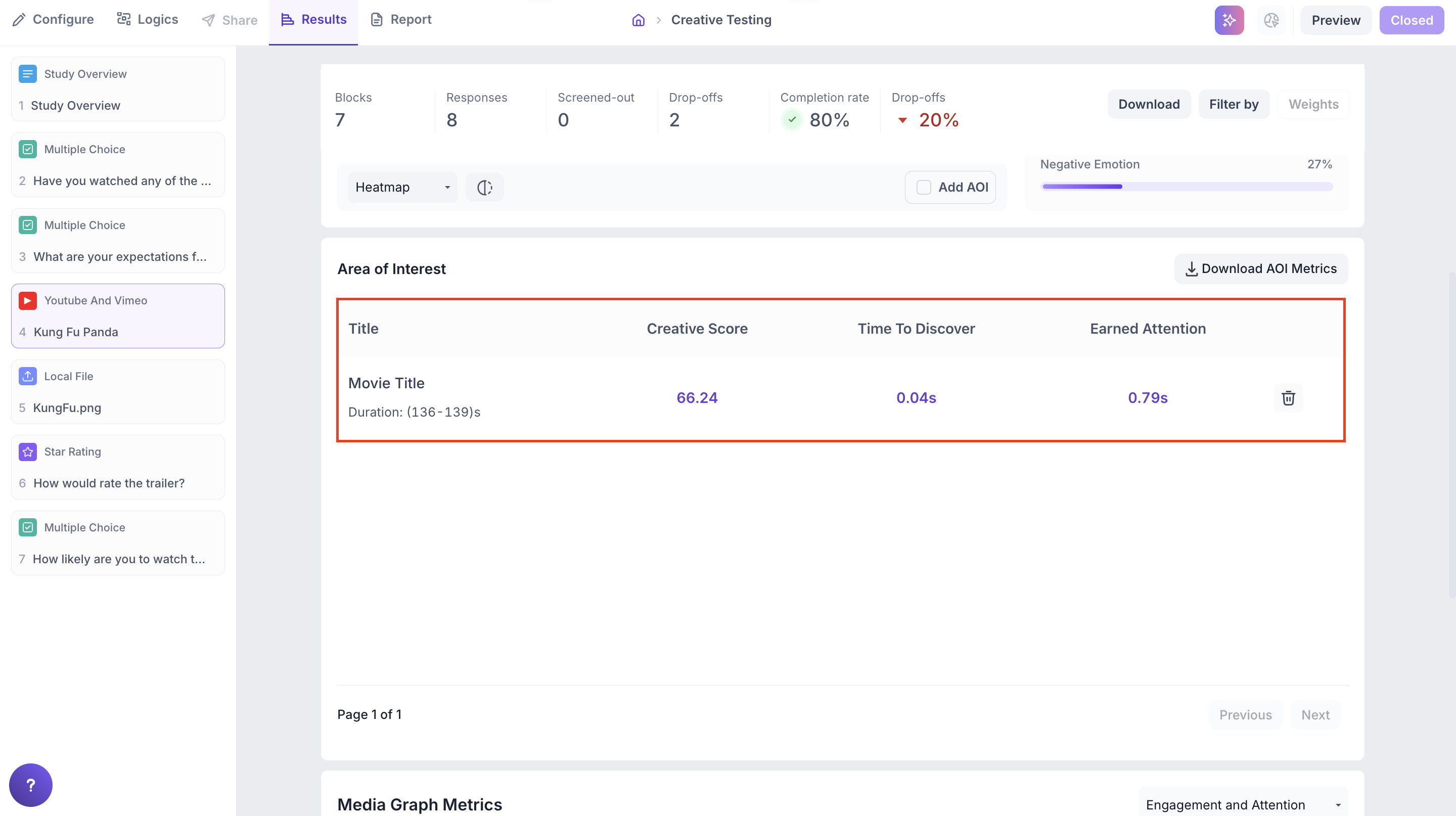 When your study includes media blocks, you will see detailed data and metrics about how respondents interacted with the media.