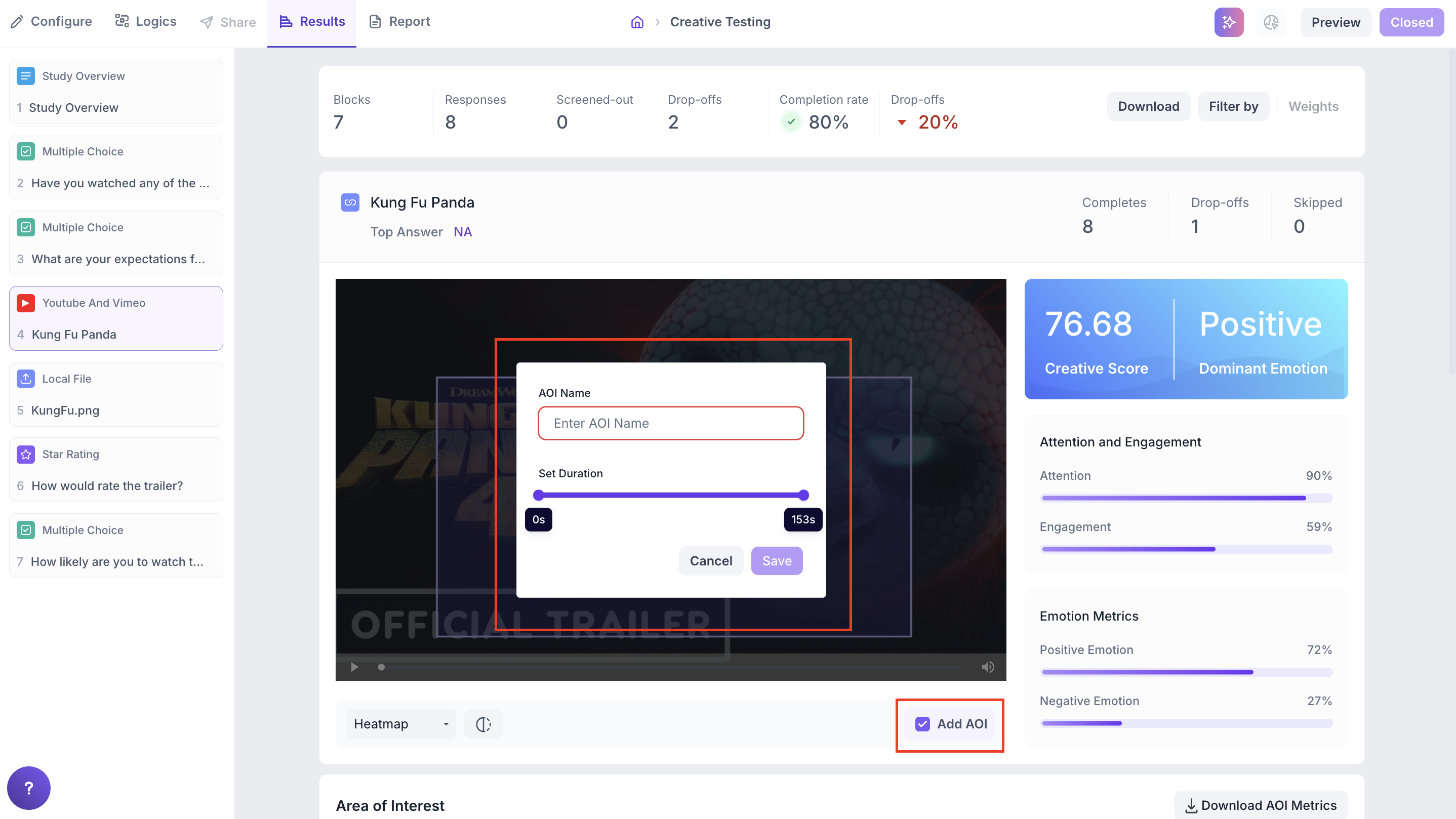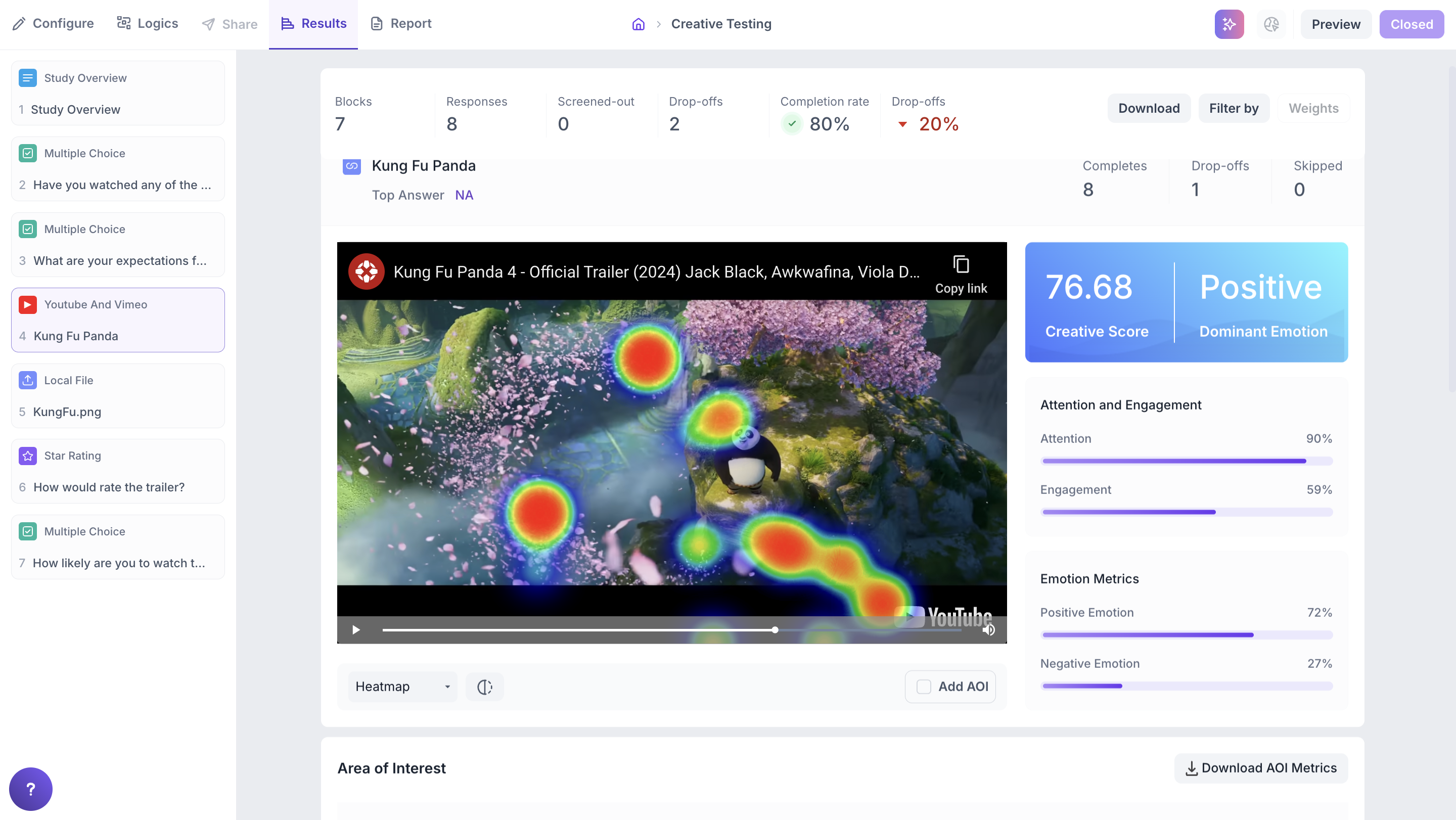 In all media question blocks within a quantitative study, the Media Dashboard provides powerful insights based on facial tracking and eye tracking, depending on the tracking technology selected during study setup.This section explains the Media Results Dashboard and the available metrics to help you interpret respondent behavior and emotional reactions.