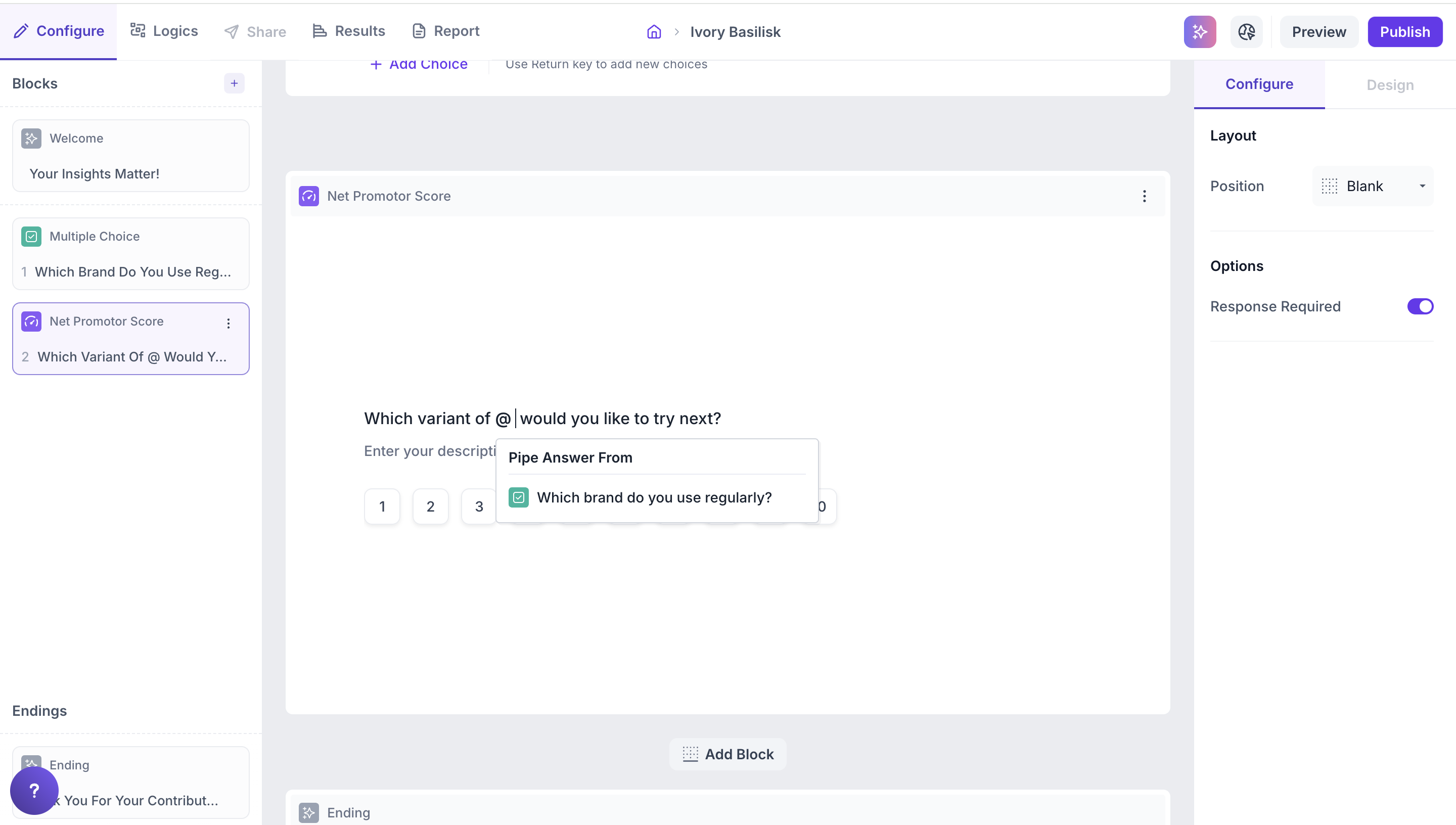 Enter the Question: Type your question in the input field. To personalize it using a previous response, type " @ " to pipe in answers. This feature allows you to reference earlier answers and tailor follow-up questions dynamically.