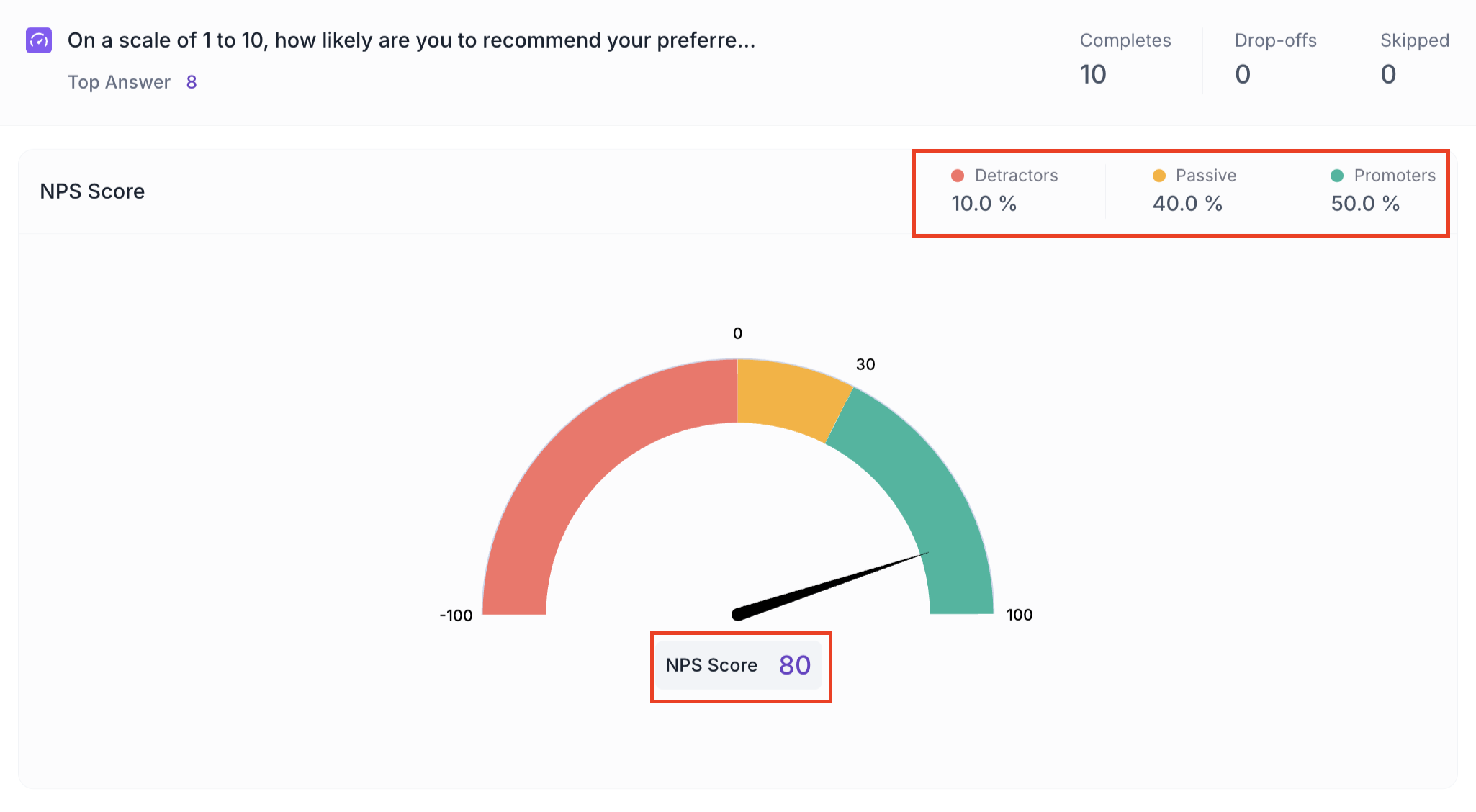 - Below the response summary, you will see the percentages of Promoters, Passives, and Detractors.