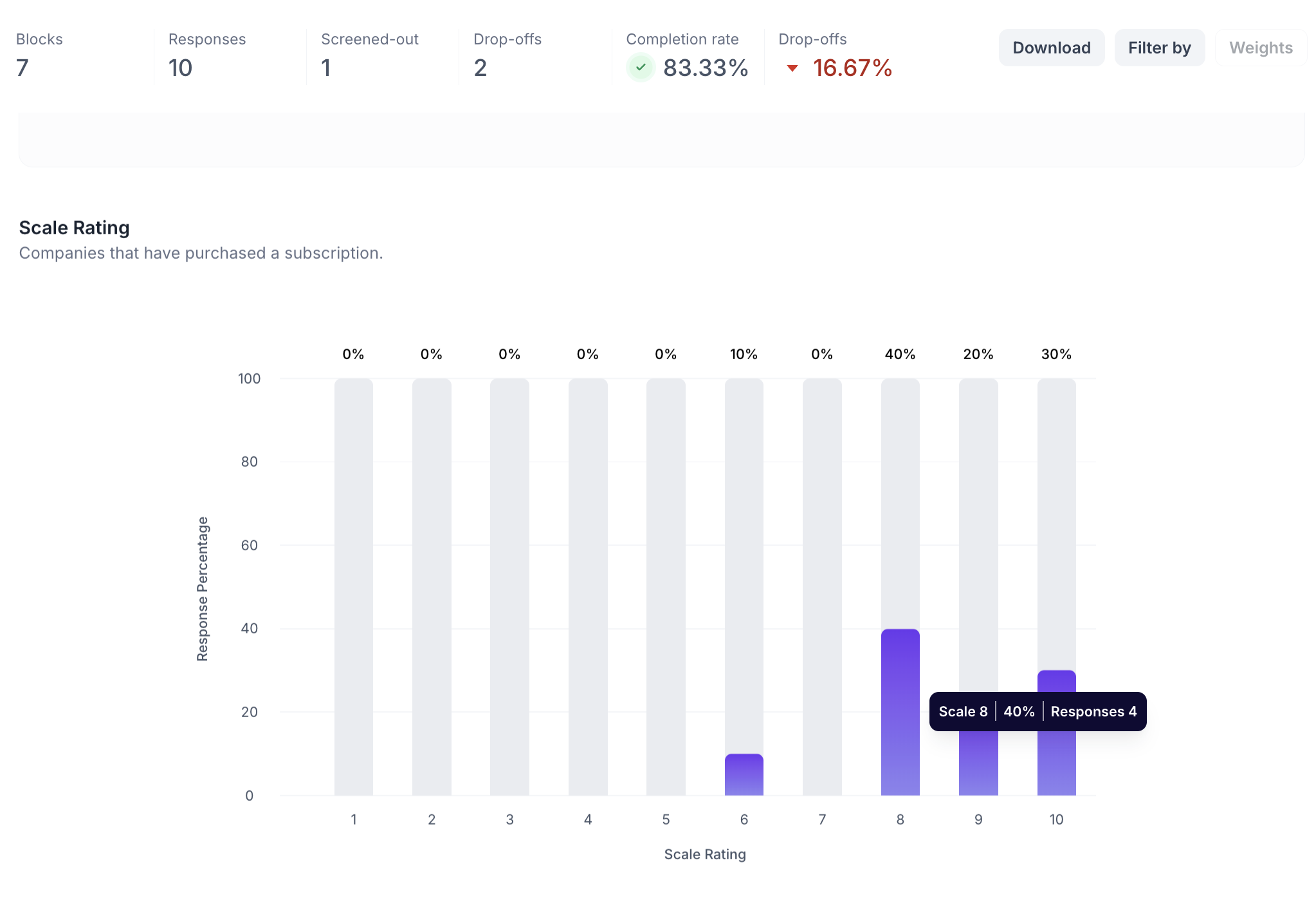 - Hovering over a column shows the scale selected, number of respondents, and percentage.