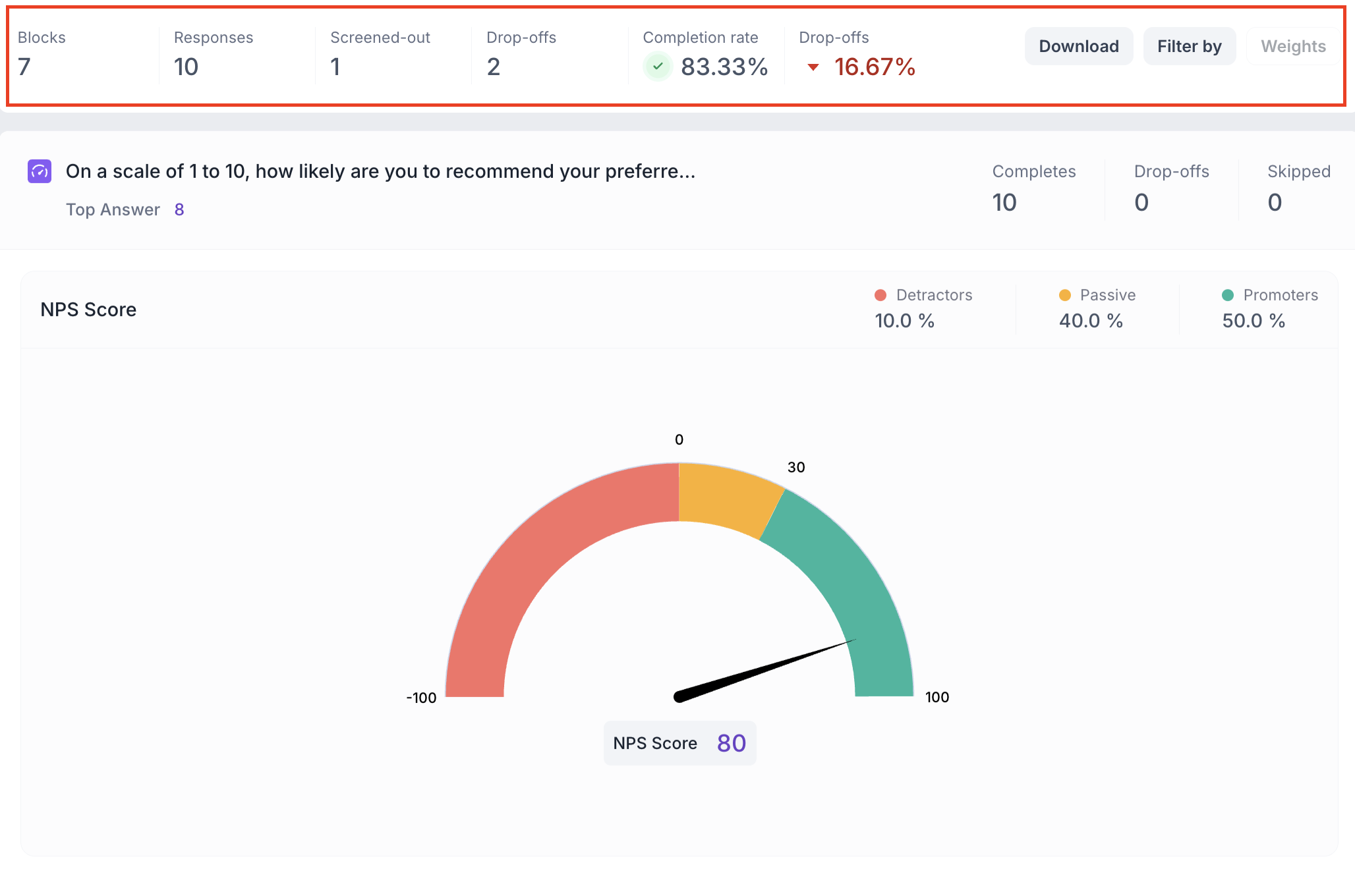Once your study is live and responses are collected, you can view the results of the NPS question block in a visual and insightful format.