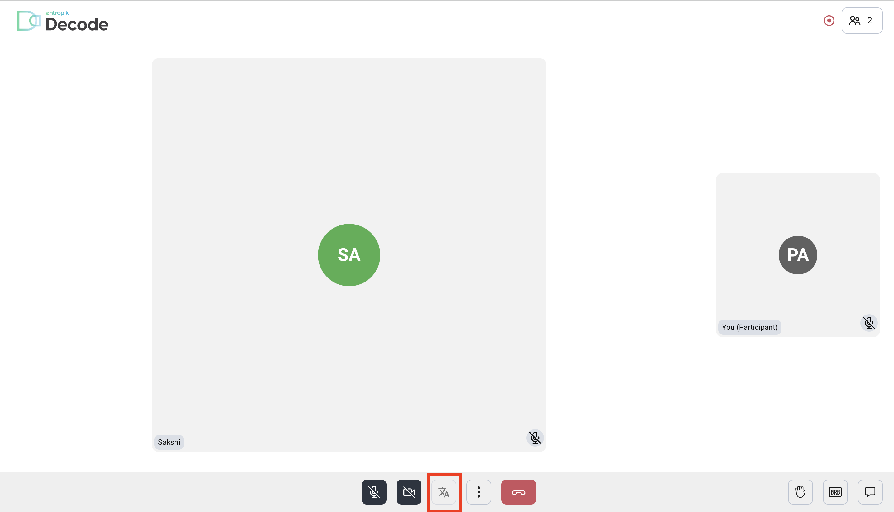 1. When an interpreter is added to a meeting in Decode, participants(Moderators, organizers, and observers) can easily locate the "Translate" icon within the meeting toolbar.