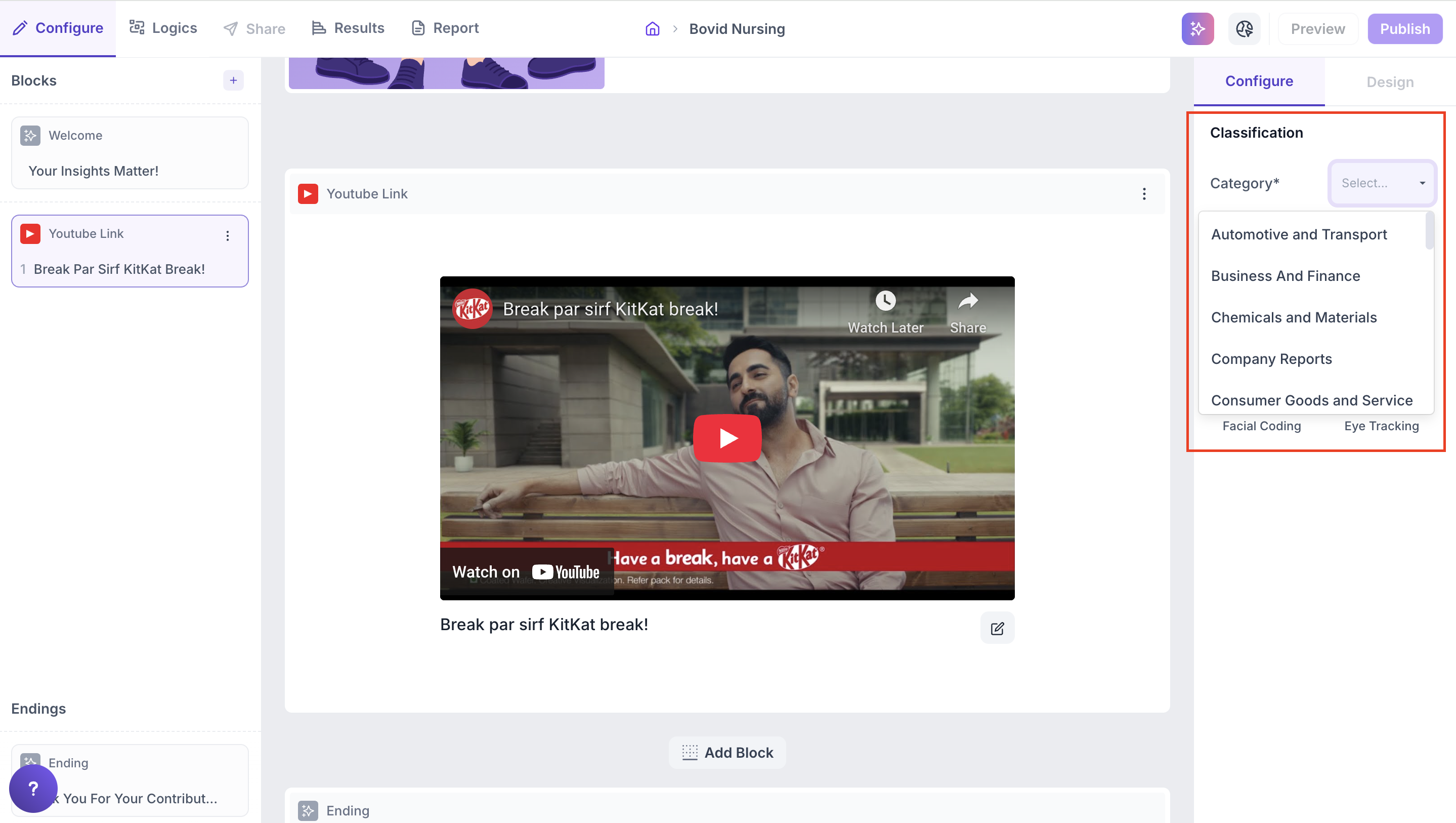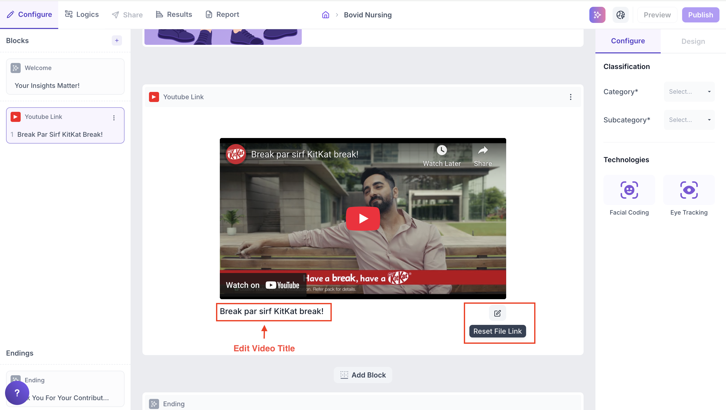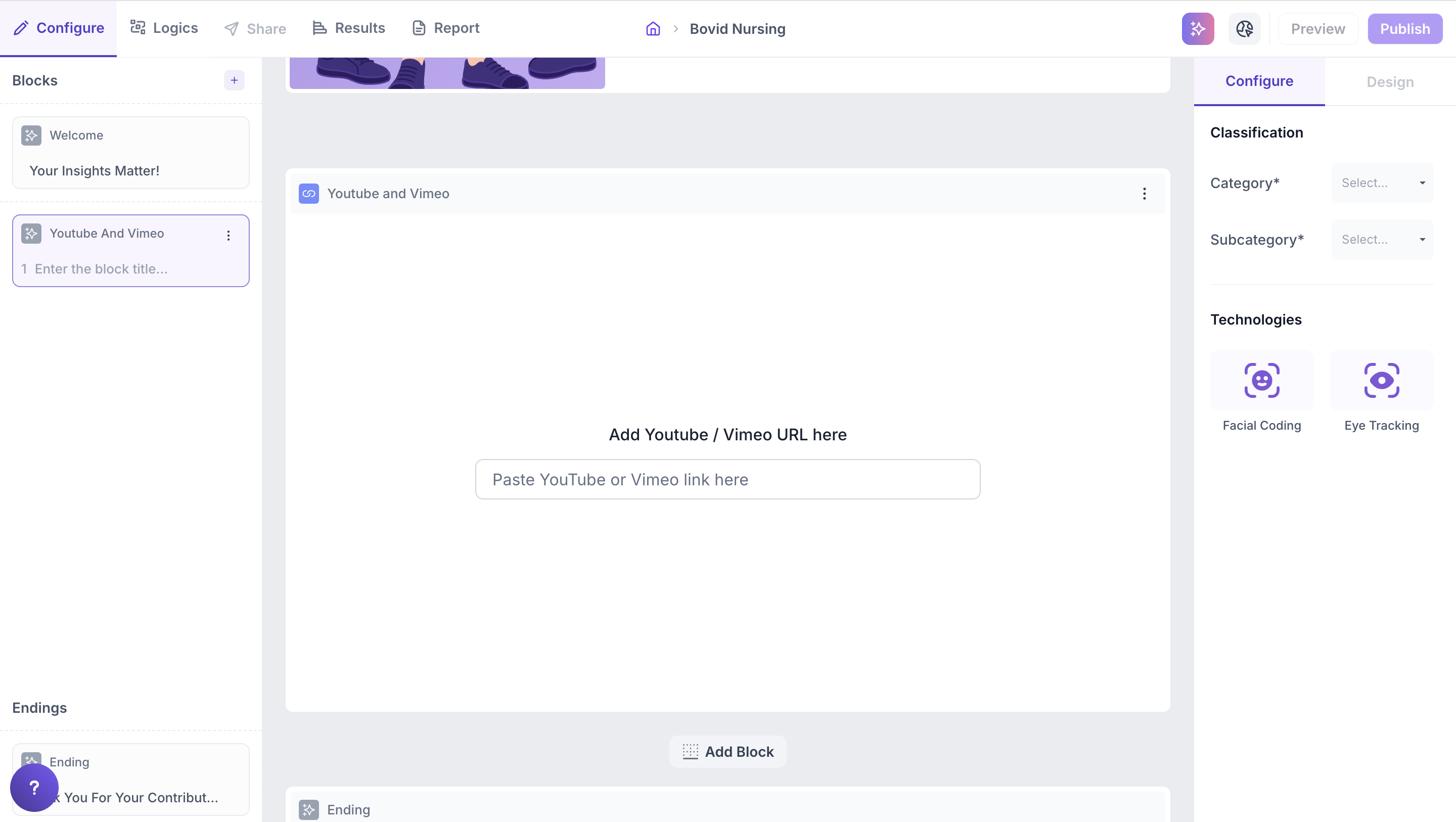 Incorporating YouTube or Vimeo videos into your survey is a powerful way to capture both behavioural and emotional insights from respondents. By embedding public video links, you can analyze how respondents react using advanced tracking technologies like Facial Coding and Eye Tracking.
